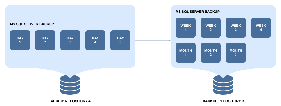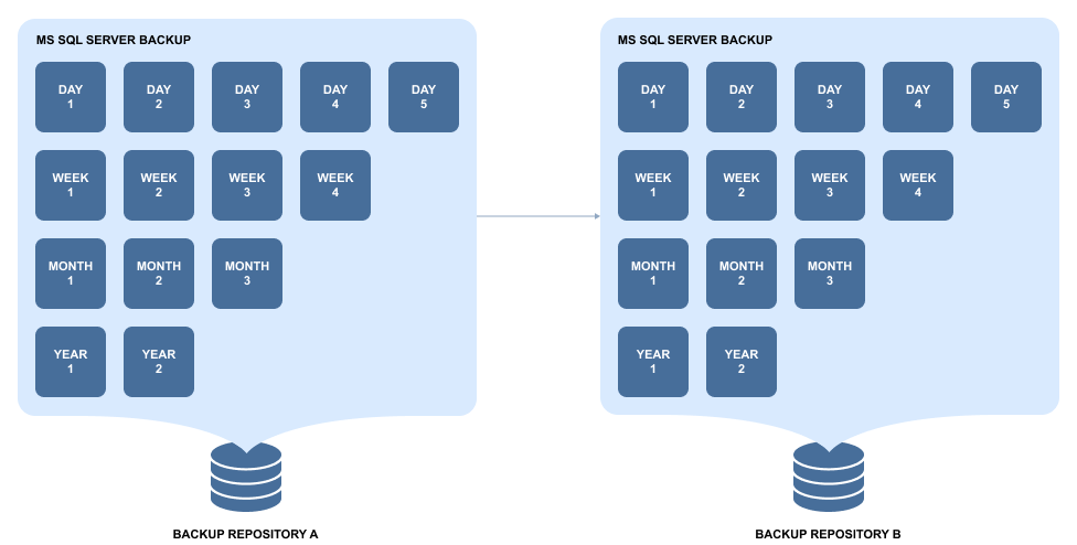 However, Backup and Backup Copy are different jobs, so you can set different retention policies for your primary backups and their copies in a different Backup Repository. This way, for example, you can store several daily backups onsite, and keep (archive) weekly, monthly, and yearly copies of backups in a secondary Backup Repository for long-term storage.