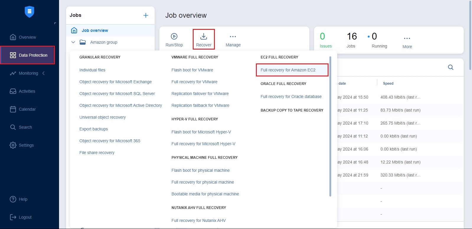 Start recovery from the Data Protection menu by clicking Recover > Full recovery for Amazon EC2.