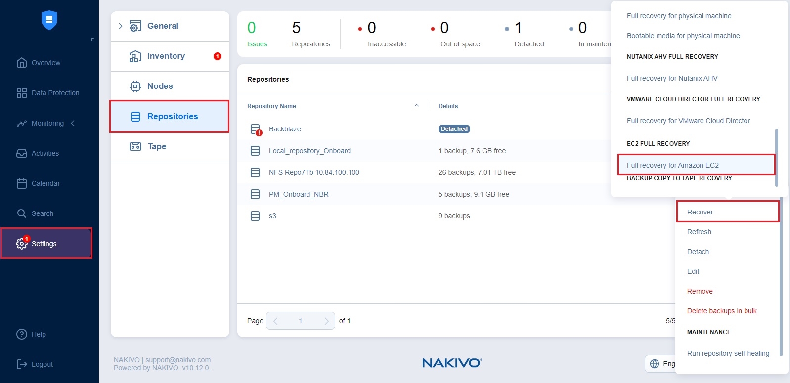 Hover over a Backup Repository that contains Amazon EC2 backups, click the ellipsis Manage button, and click Recover.