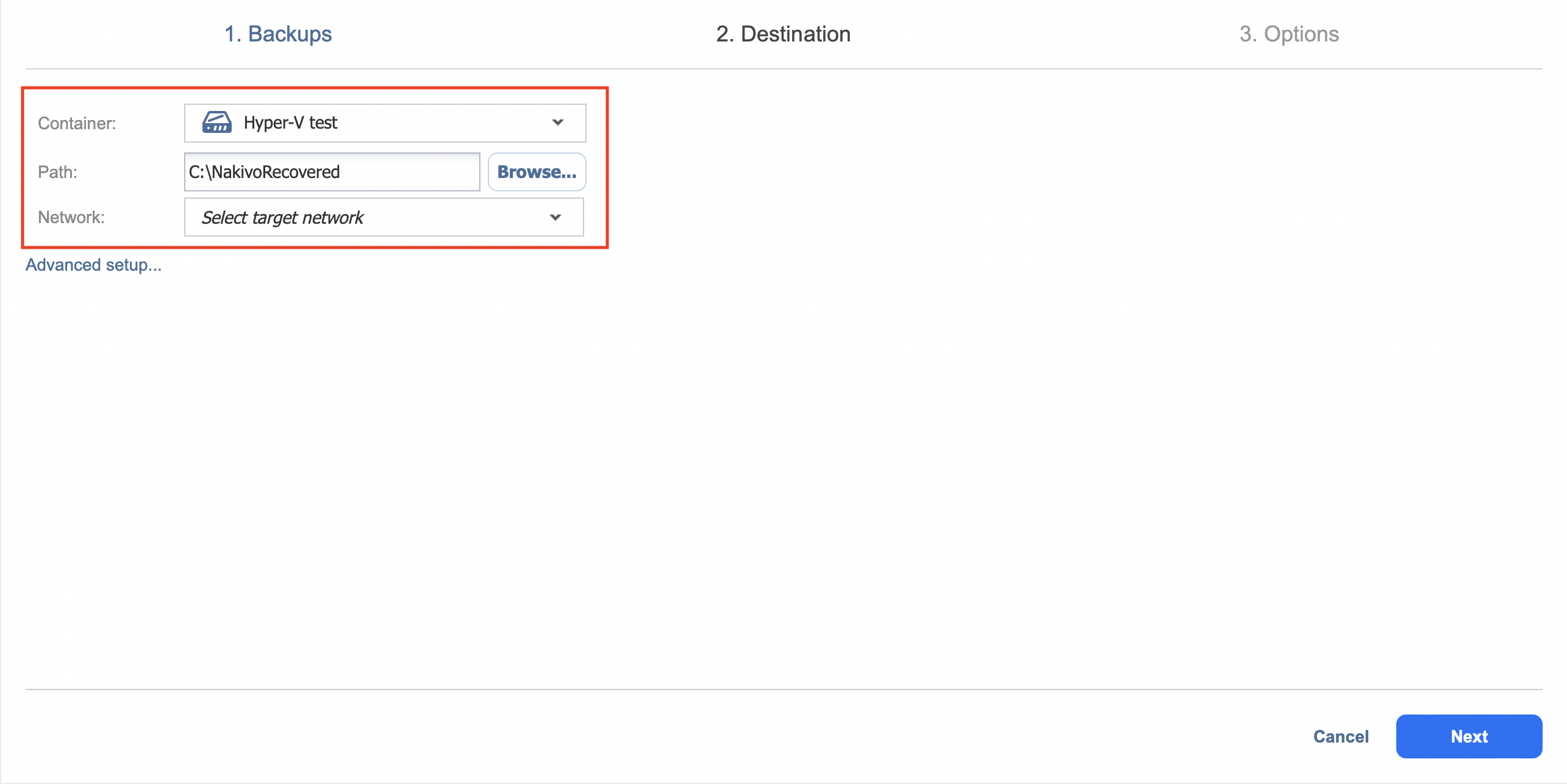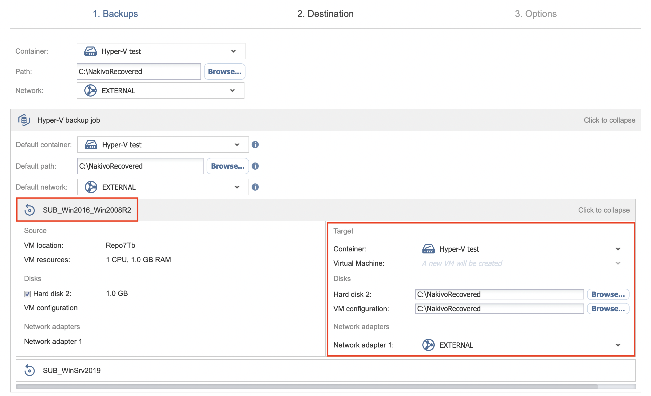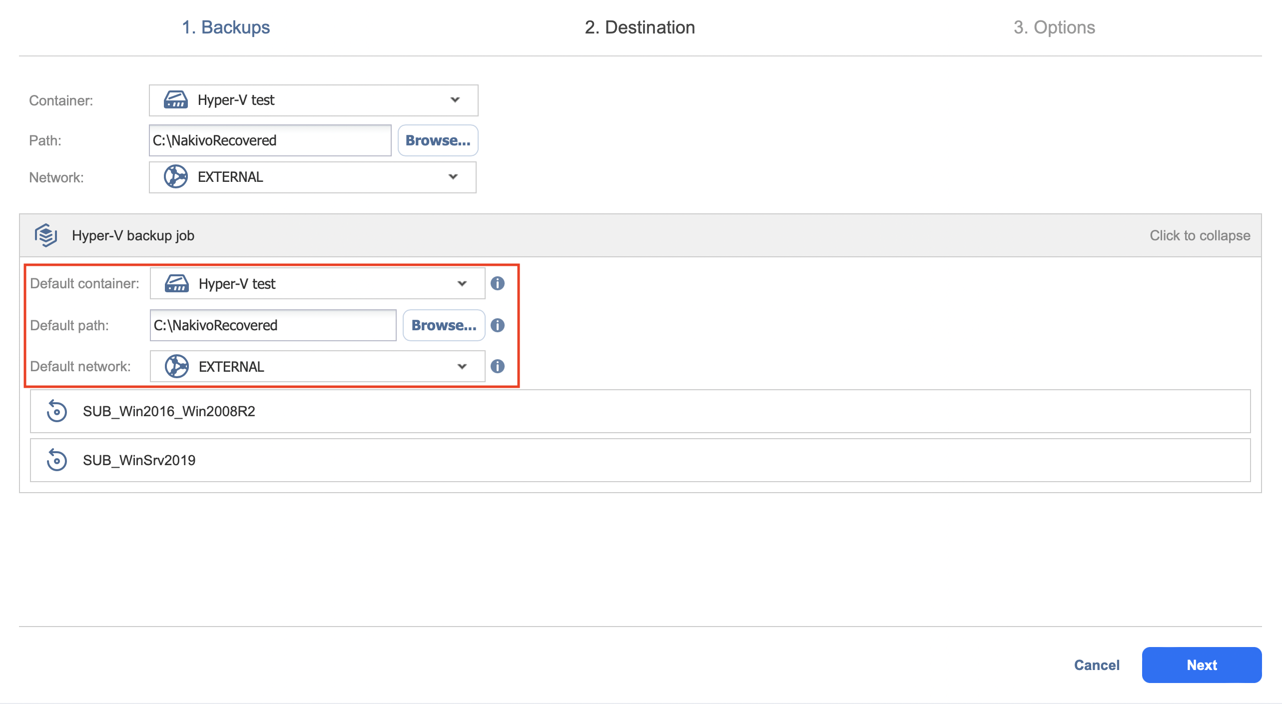 If you have chosen the backup job on the Source page, you can choose a Default Network.