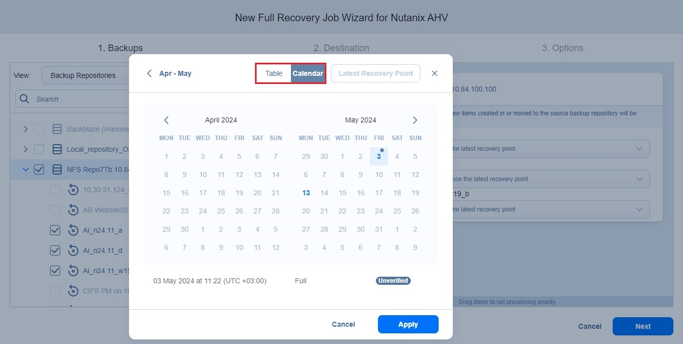 If a recovery point has been preselected (shown in the dropdown), it is selected by default when the Calendar or Table view is opened.