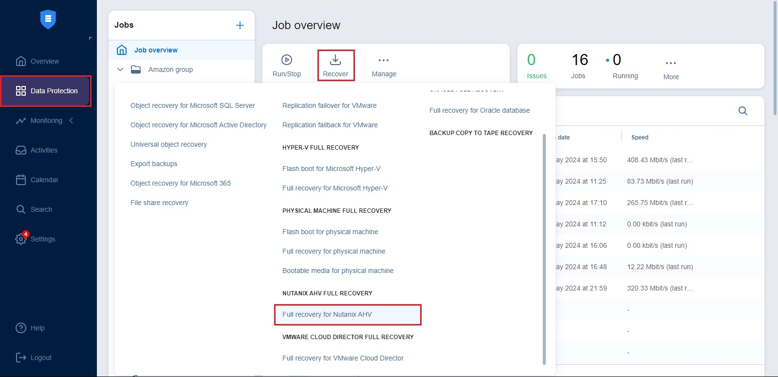 Start recovery from the Data Protection menu by clicking Recover and then clicking Full recovery for Nutanix AHV under the Nutanix AHV Full Recovery section.