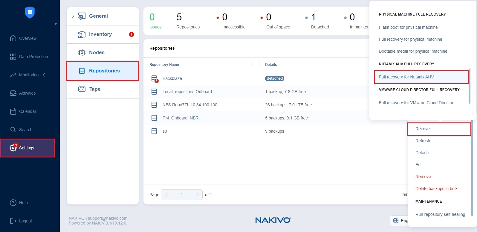 Hover over the Backup Repository containing the needed backup, click the ellipsis Manage button, and click Recover.