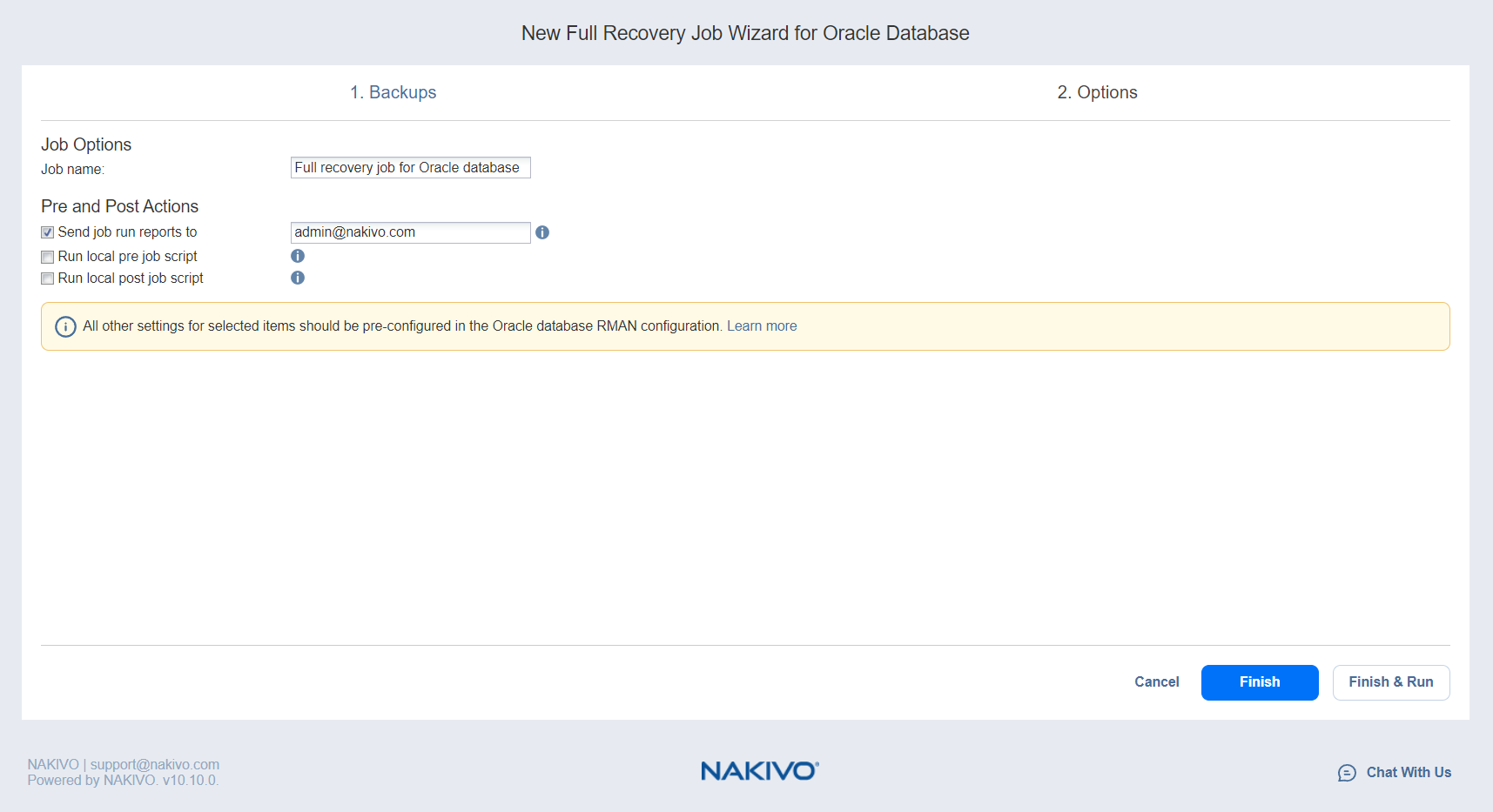 On the Options page, you can name the recovery job and set pre- and post job actions.