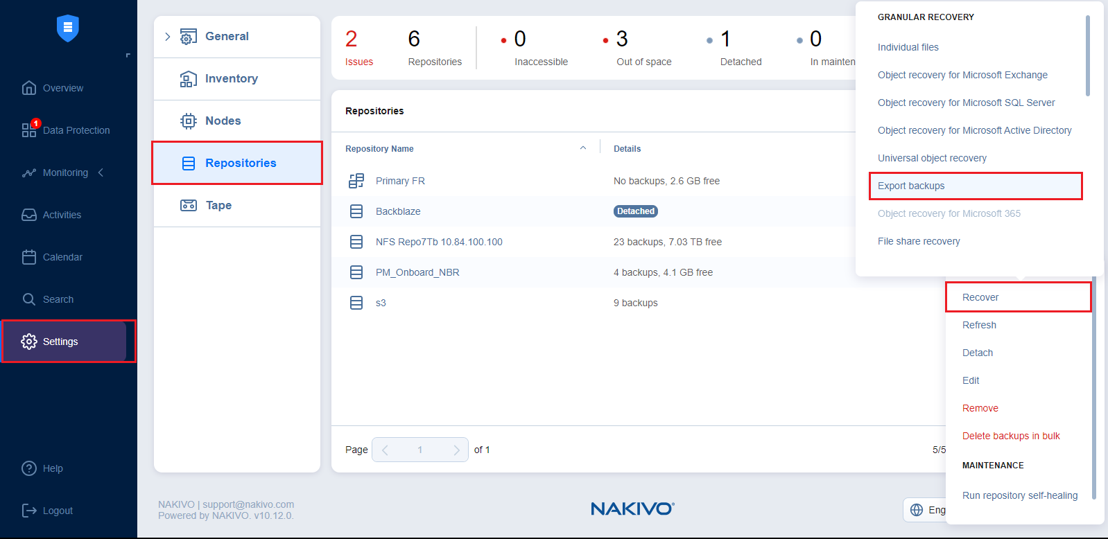Navigate to the Data Recovery menu, click Recover and then click Export backups.