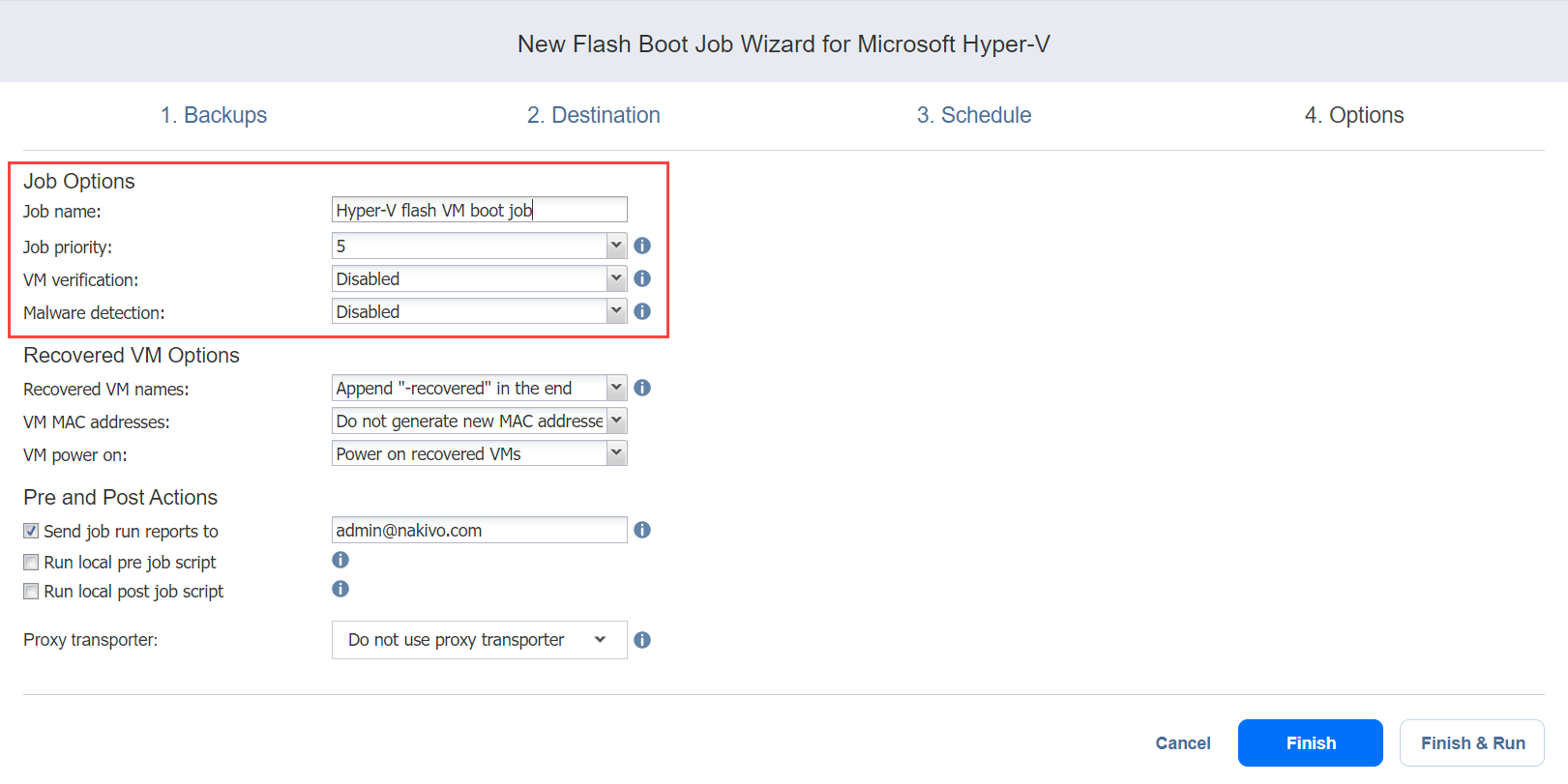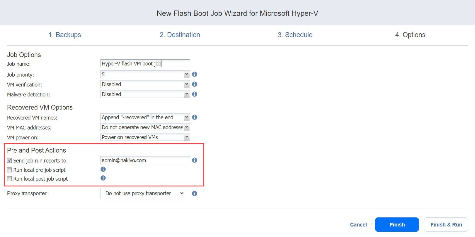 NAKIVO Backup & Replication allows you to run a script before Flash boot begins (a pre-job script) and after the boot of all VMs in the job has completed (a post-job script). The scripts can be executed only on the machine where the Director is installed. Refer to Pre and Post Job Scripts for details.