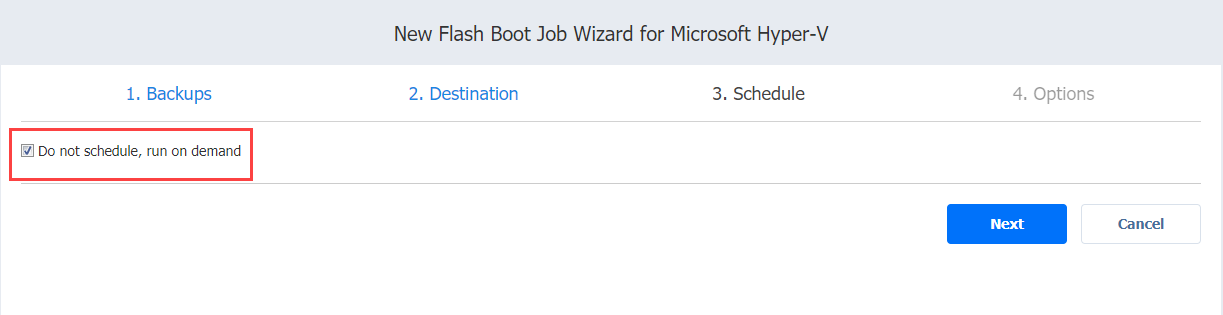 If you want to start the job manually only (without any schedule), select the Do not schedule, run on demand checkbox and click Next.
