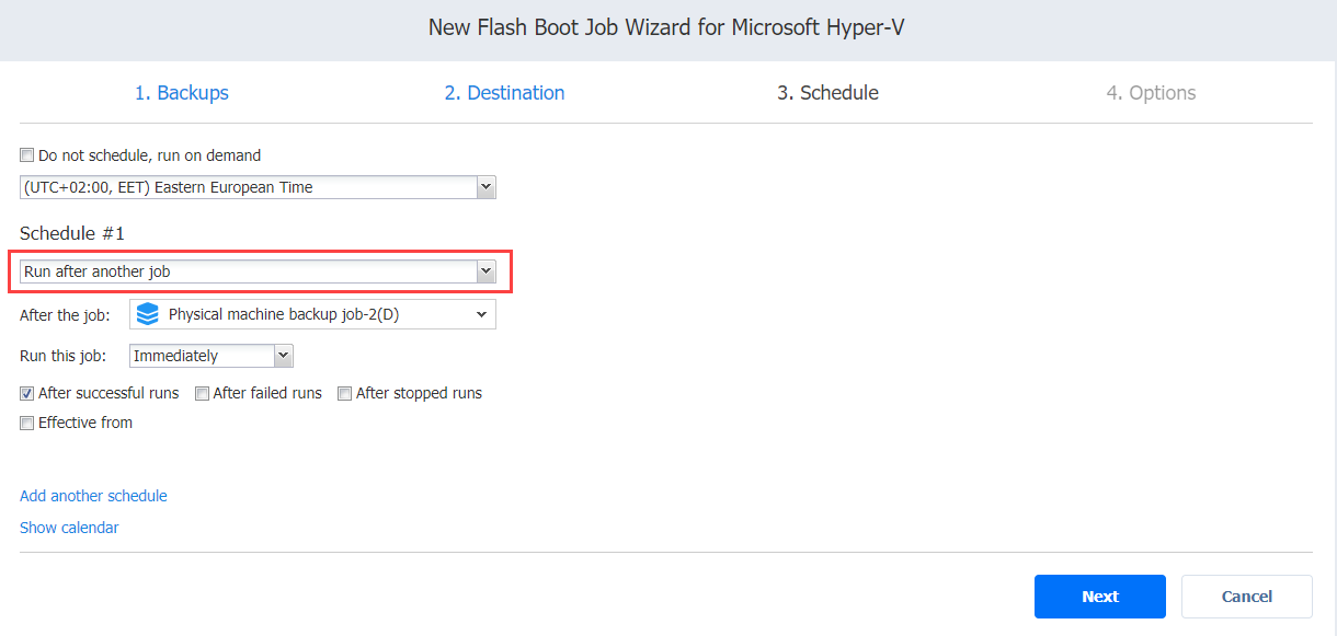 To run the job after a previous one has completed, choose Run after another job from the schedule drop-down list and set the options as follows: