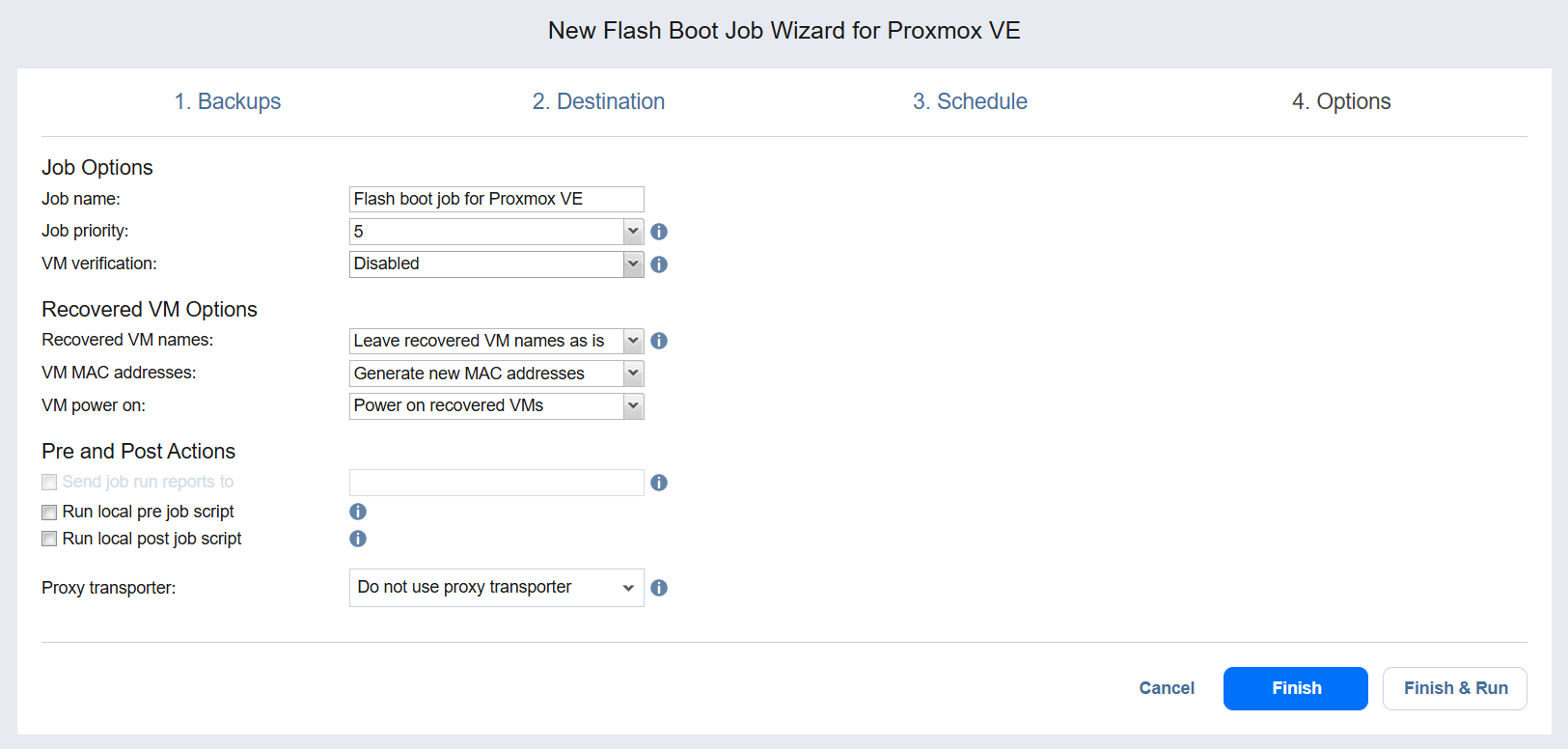 NAKIVO Backup & Replication allows you to run a script before Flash boot begins (a pre-job script) and after the boot of all VMs in the job has completed (a post-job script). The scripts can only be executed on the machine where the Director is installed. You can also set up email notifications for the job.