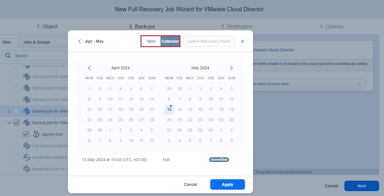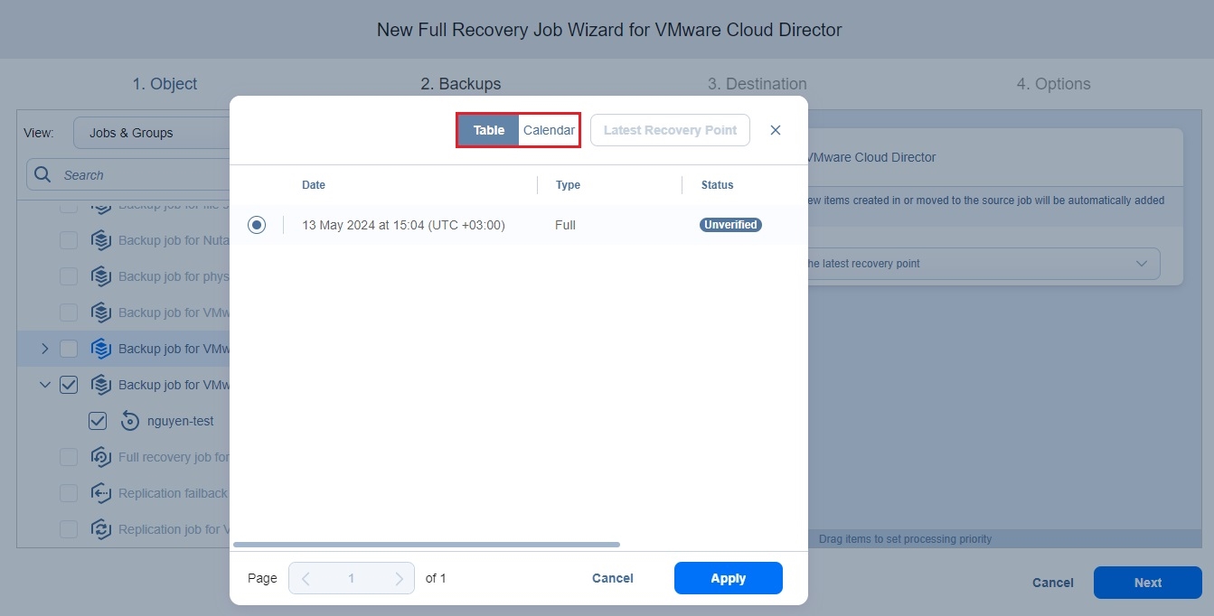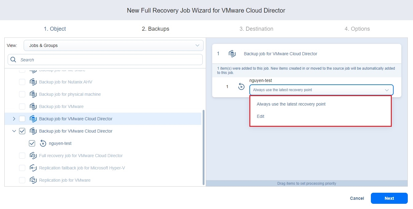 Recovery Job Wizard for VMware Cloud Director: Backups