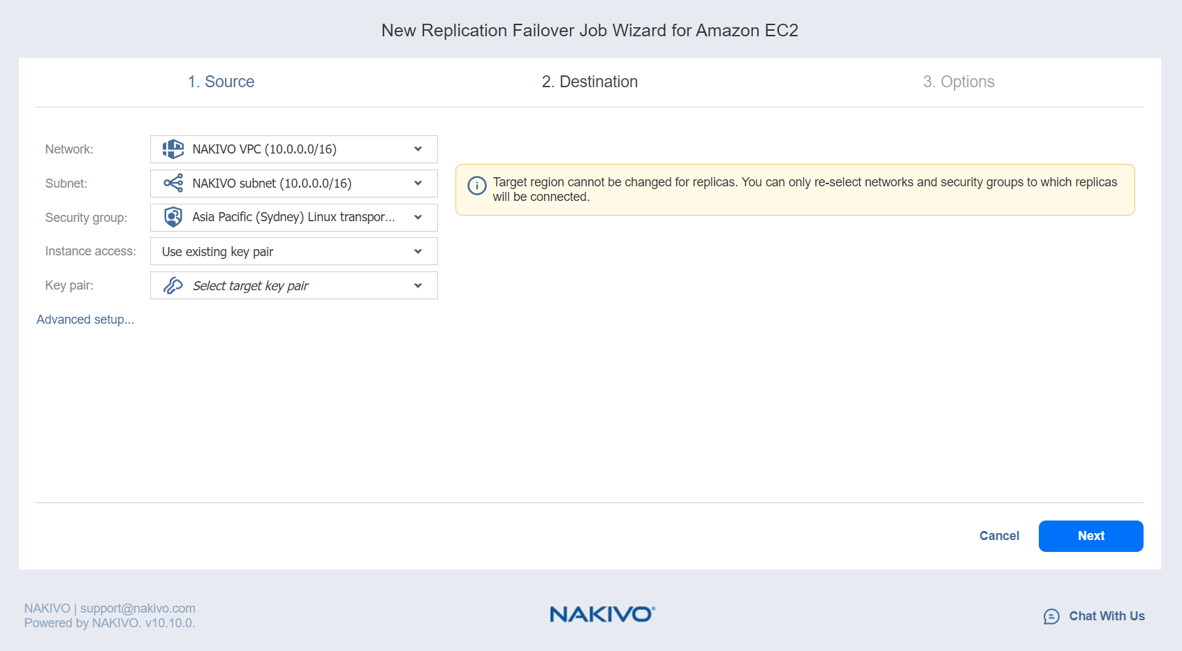 To fail over all Amazon EC2 instances defined in the previous page in the wizard to the same AWS region and with the same options, set up the following:
