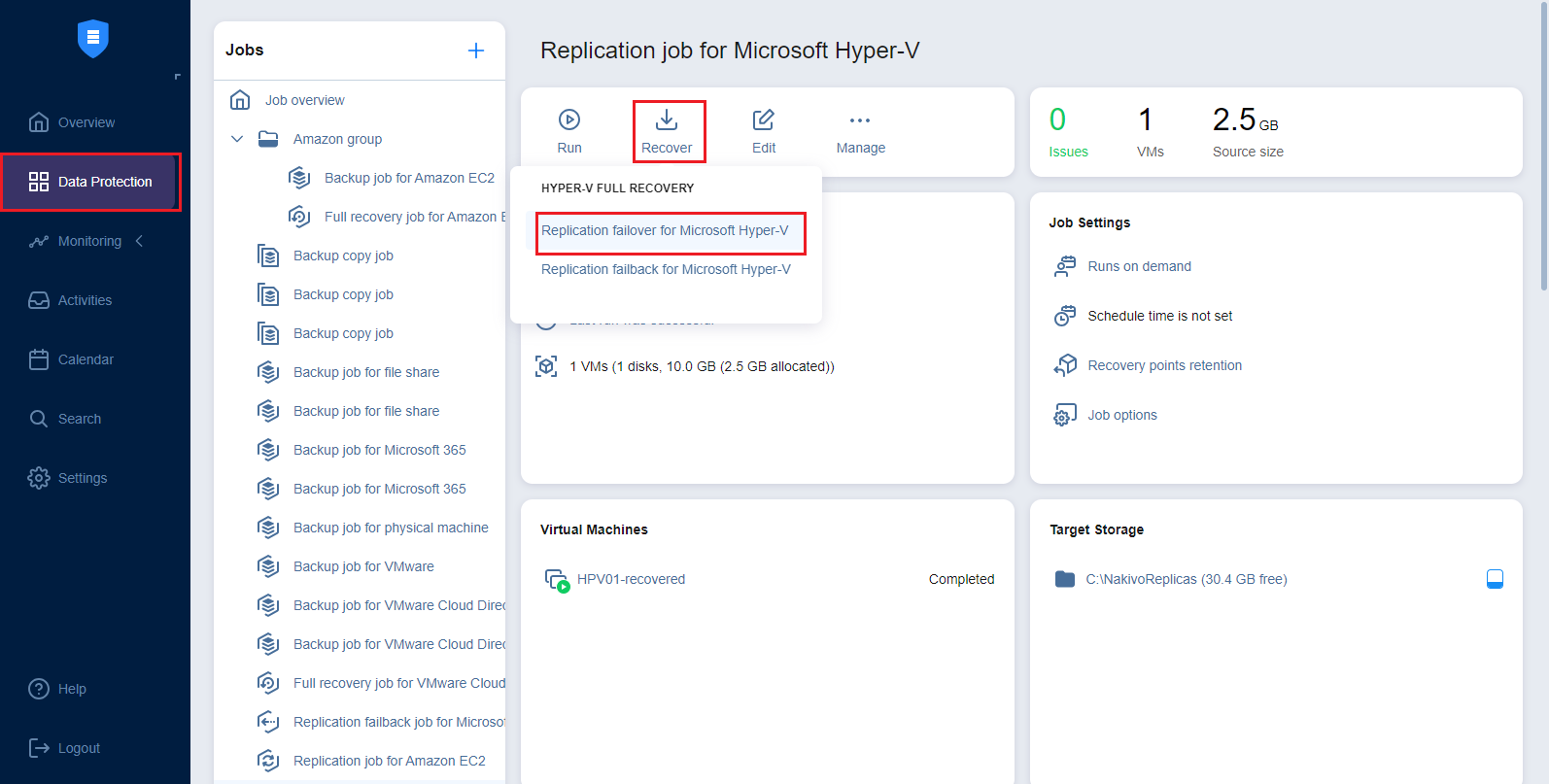 Alternatively, select the relevant replication job and click Recover > Replication failover for Microsoft Hyper-V.