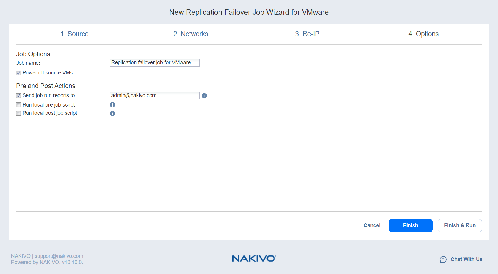 Send job run reports to: When selected, a job report is sent to specified recipients each time the failover job has completed. This overrides the default setting in the NAKIVO Backup & Replication Settings.