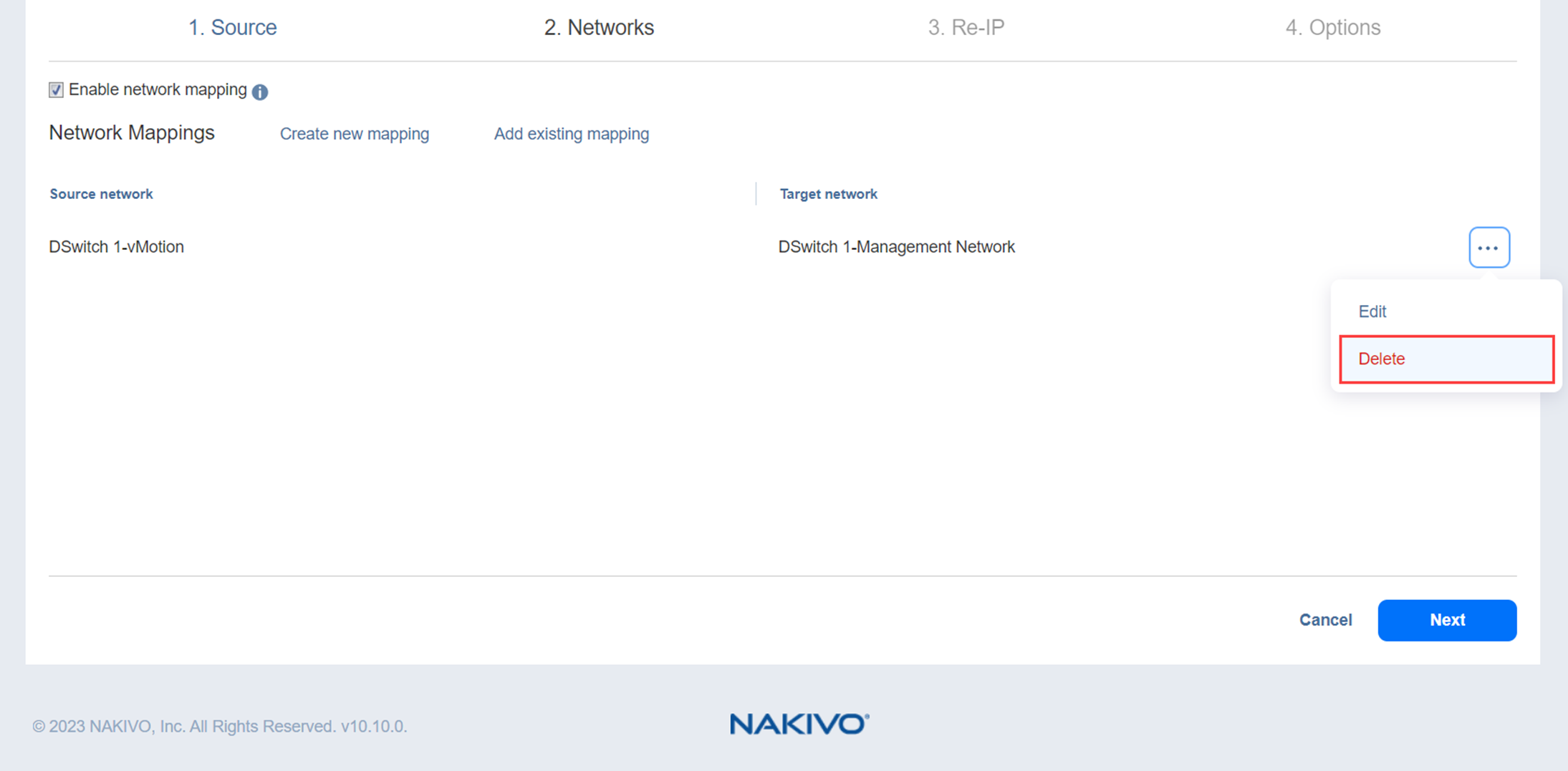 Delete an existing mapping: hover over the necessary item in the Network Mappings list and then click the ellipsis Manage button to the right of the item. Then, click Delete.