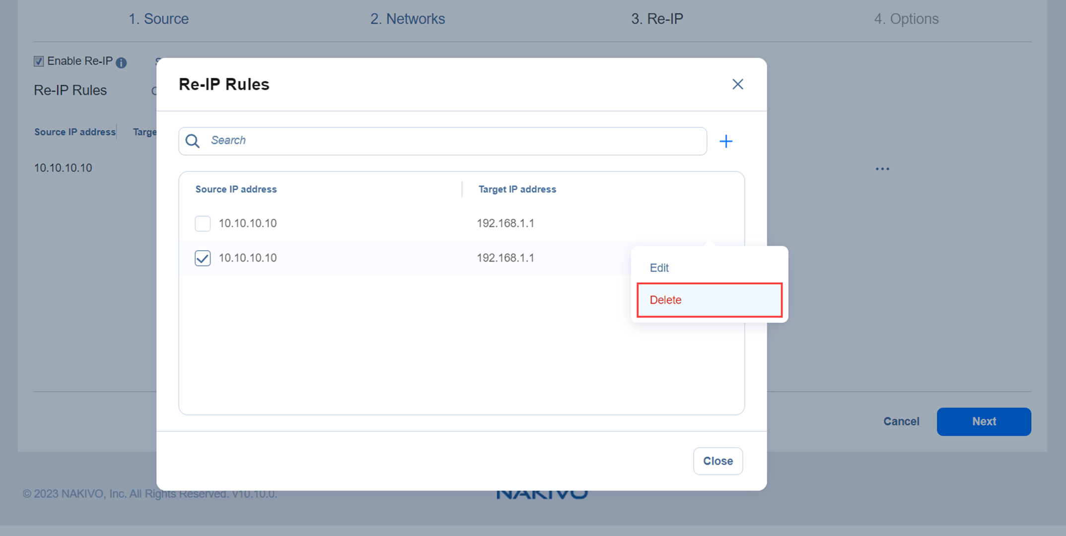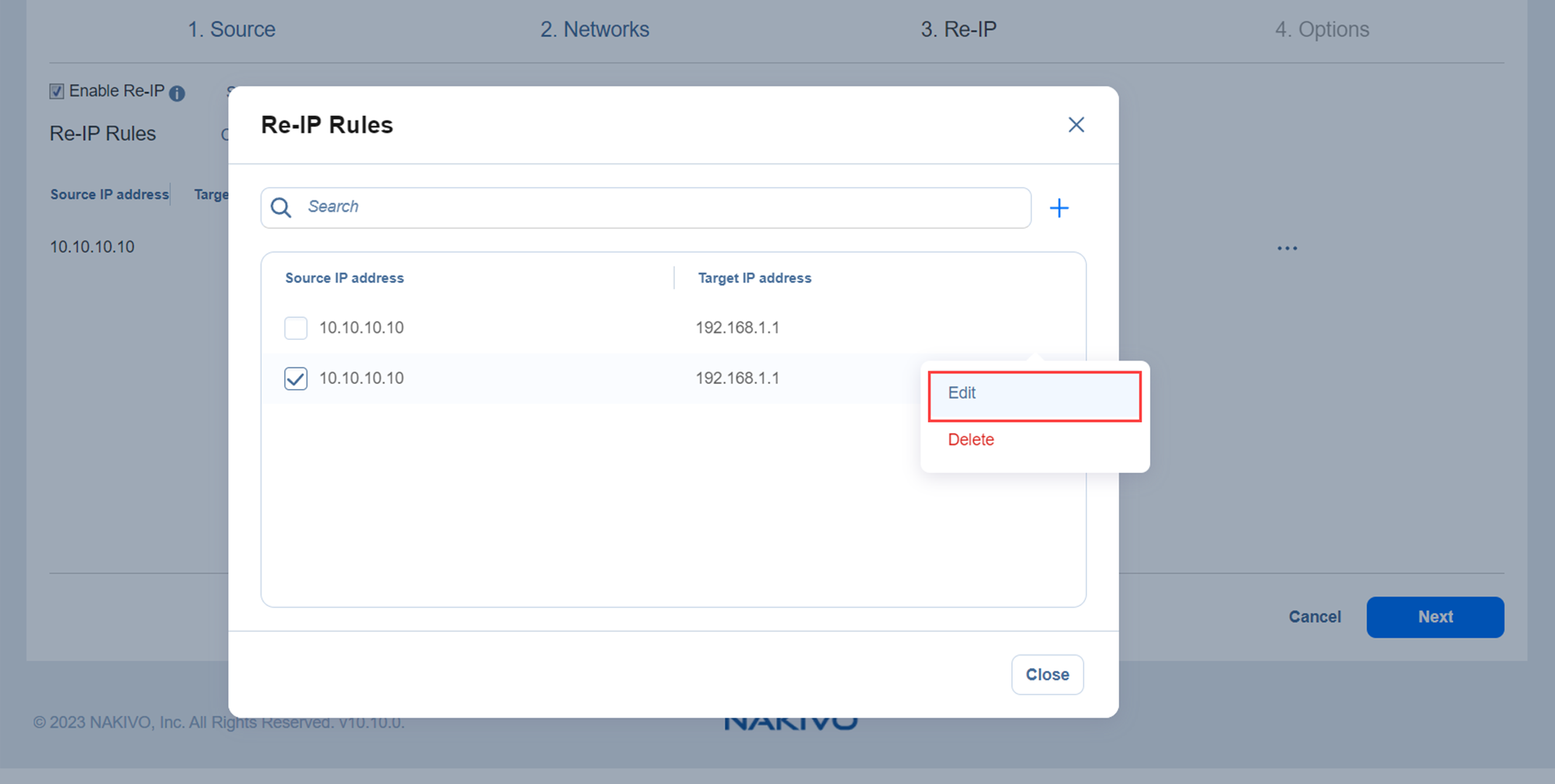 The Re-IP dialog box opens. In the list of your source VMs, select at least one VM and close the dialog box.
