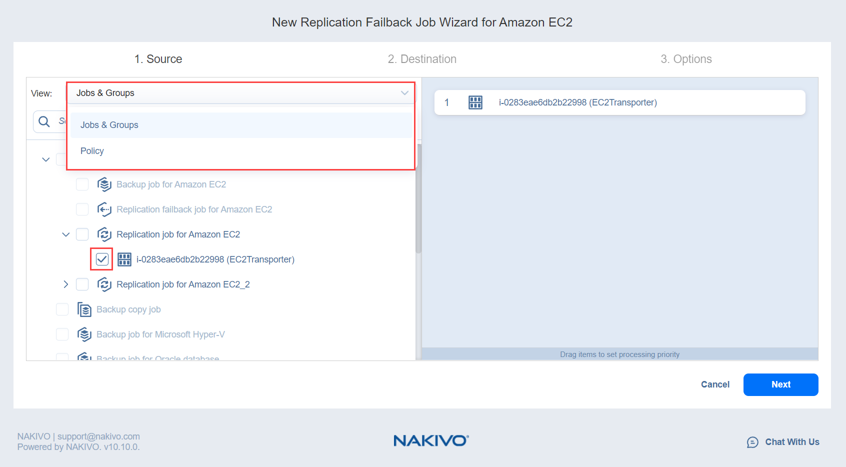 Jobs & Groups: When selected, the inventory tree displays groups, jobs, and backups of the appropriate hypervisor. You can select the required replica from the list of replication jobs.