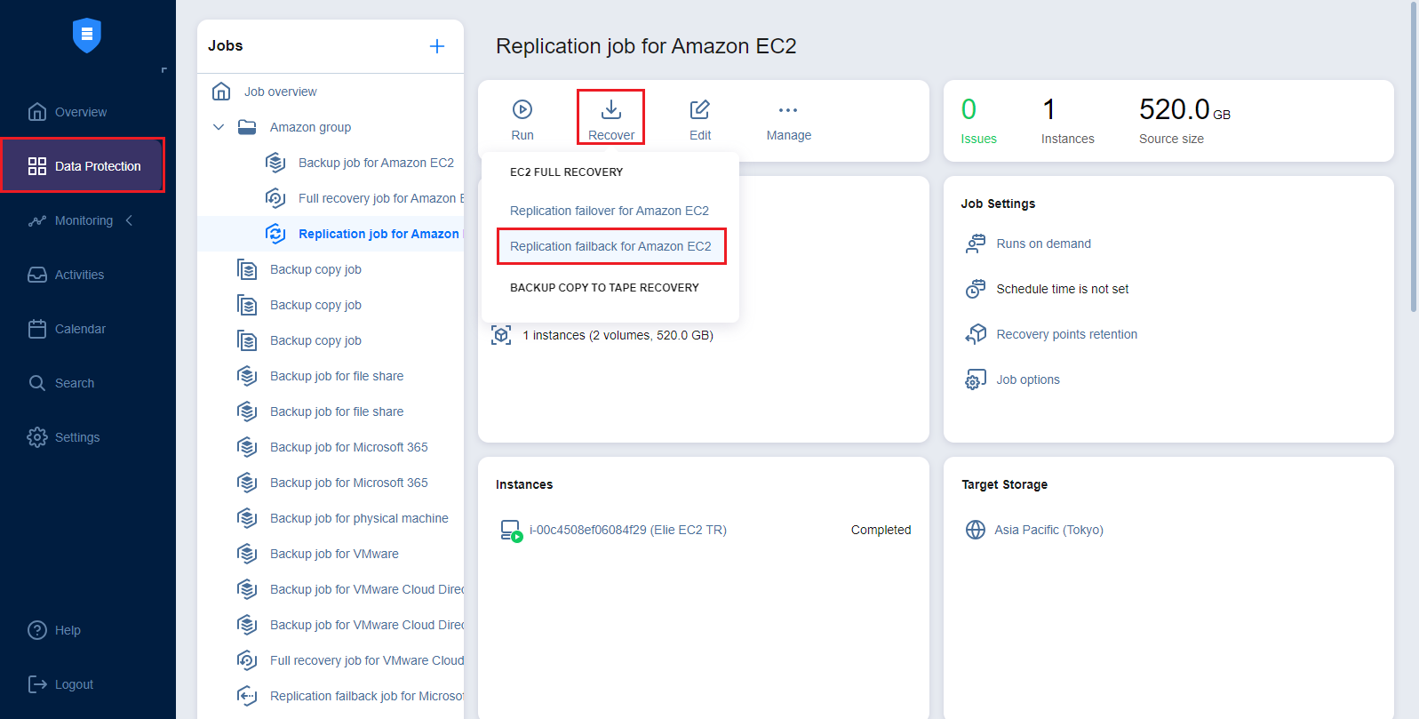 To start the failback procedure, click Recover in the Data Protection menu and then click Replication failback for Amazon EC2 in the EC2 Full Recovery section. Alternatively, the failback can be performed by using by using the search function.
