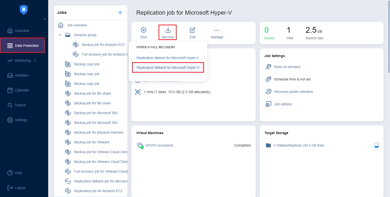 To start the failback procedure, click Recover in the Data Protection menu and then click Replication failback for Microsoft Hyper-V in the Hyper-V Full Recovery section. Alternatively, the failback can be performed by using by using the search function.