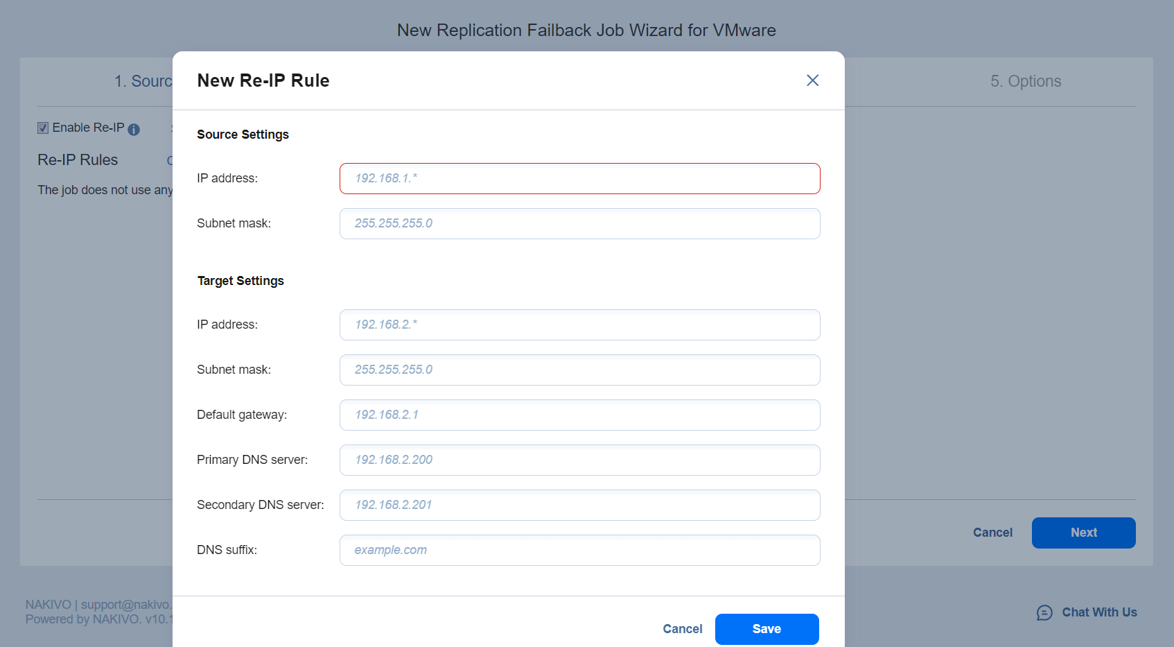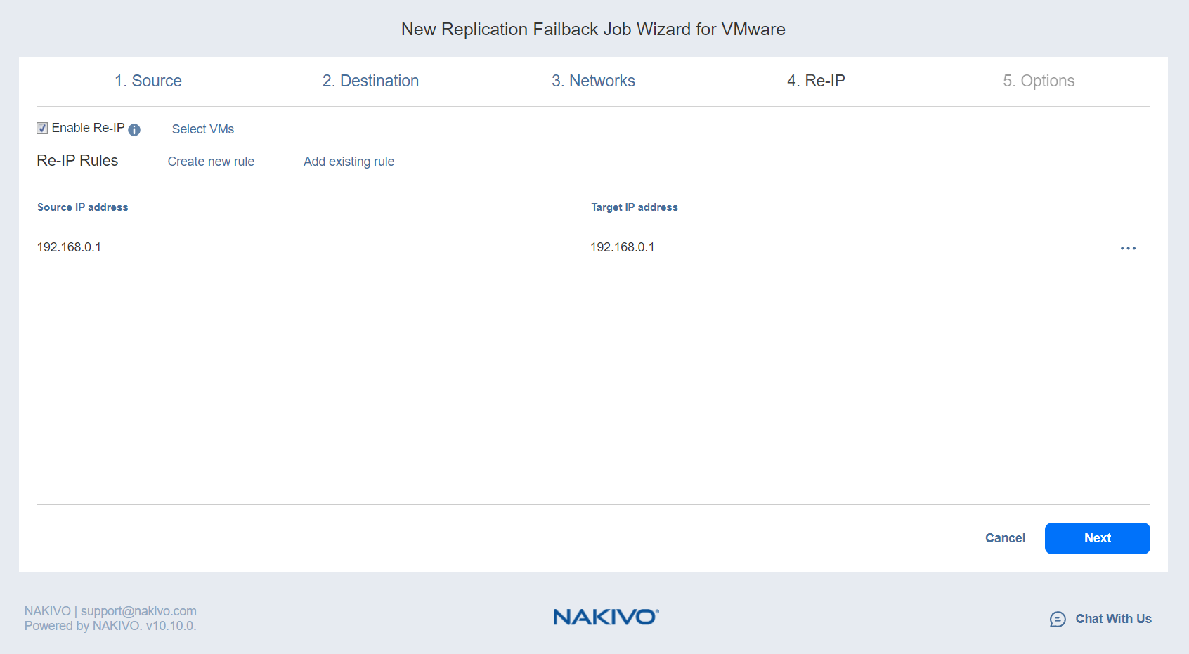 When you enter 192.168.1.* -> 10.30.30.* Re-IP rule, the source VM IP address such as192.168.1.50 will be changed to the 10.30.30.50 IP address for your replica failback job. When there are several Re-IP rules applicable to your source VM, the application will define the most suitable one and apply it to the source VM IP address.