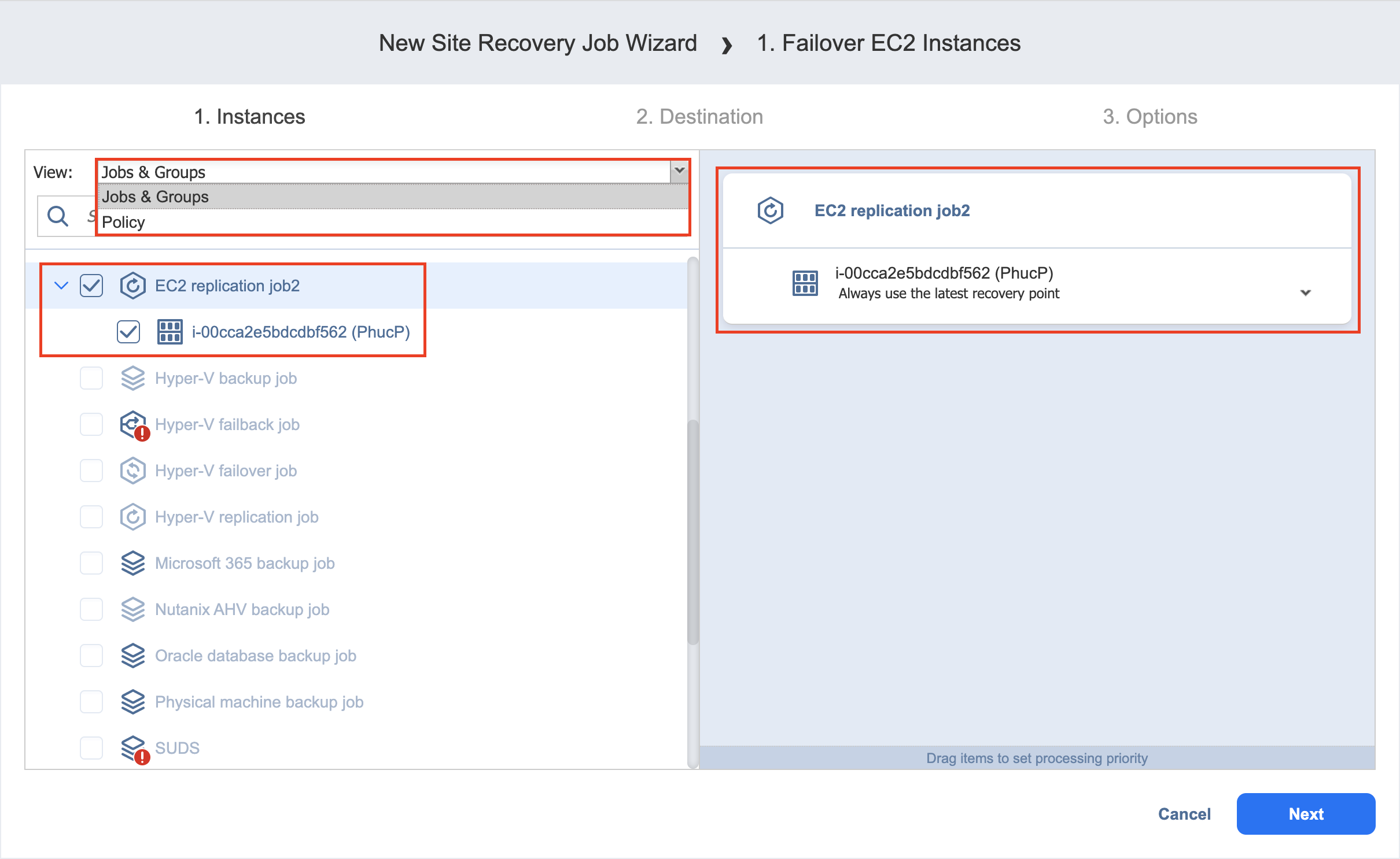 Jobs & Groups: When selected, the inventory tree displays groups, jobs, and backups of the appropriate AWS account. You can select the required replica from the list of replication jobs.