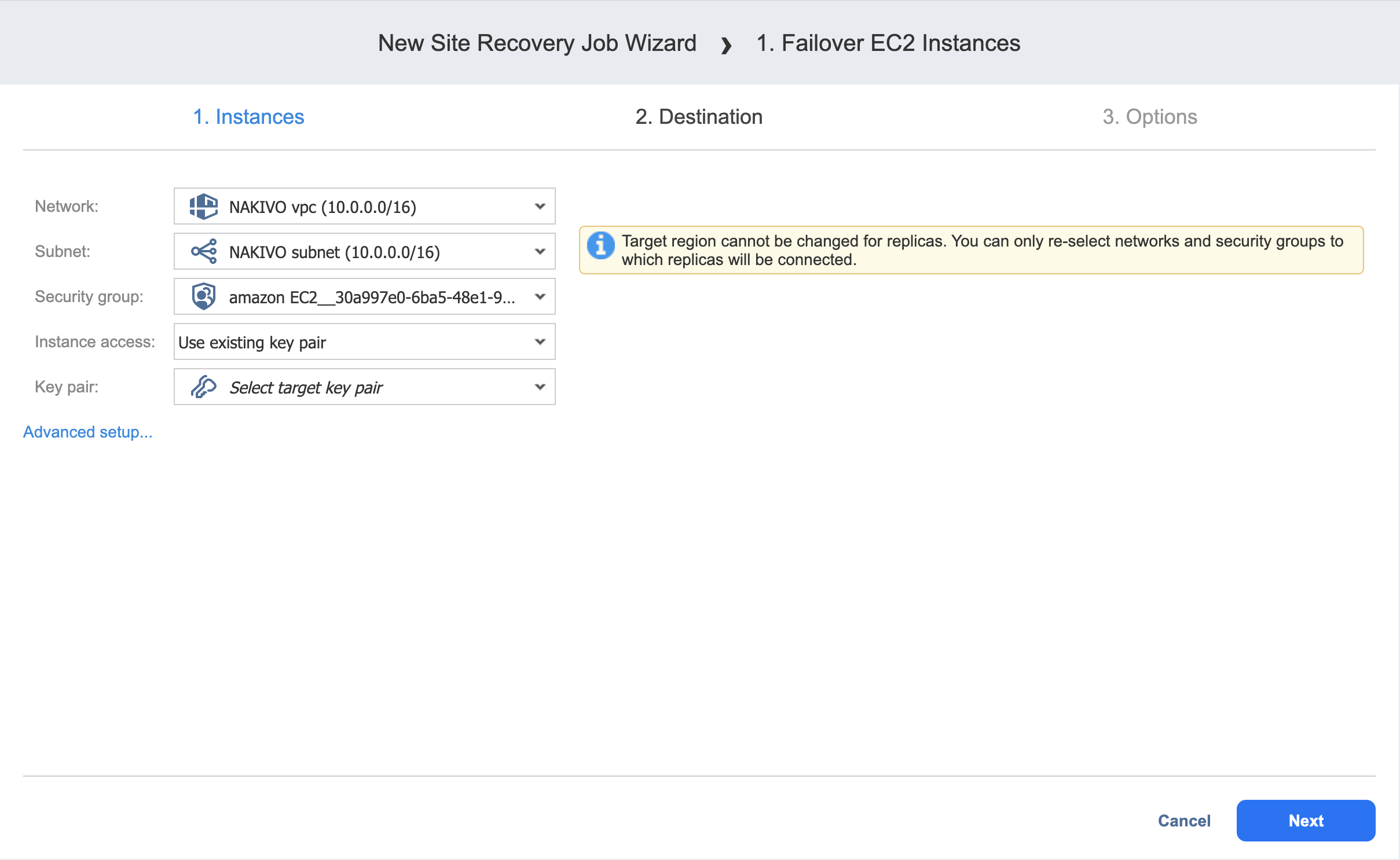 To fail over all Amazon EC2 instances defined in the previous page of the wizard to the same AWS region and with the same options, do the following: