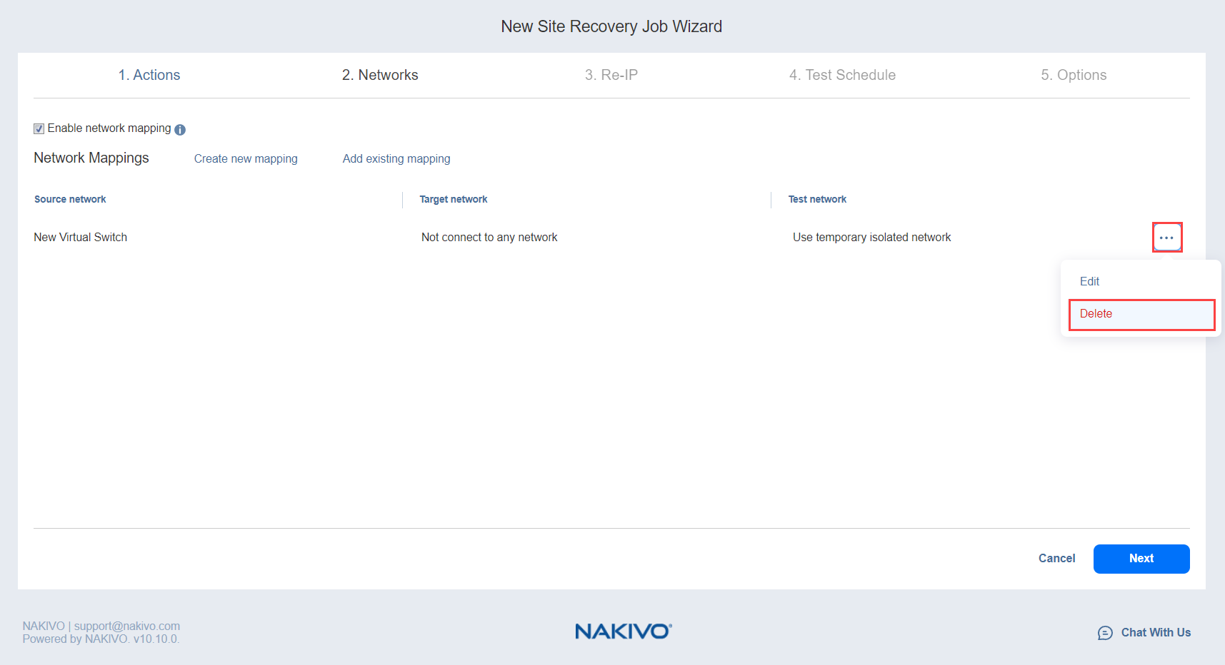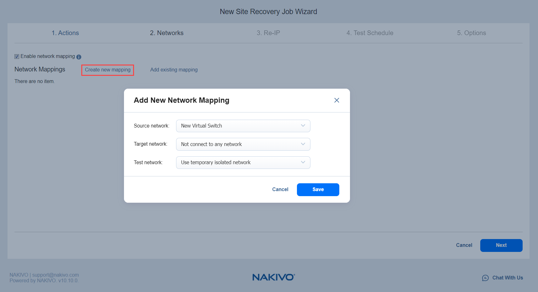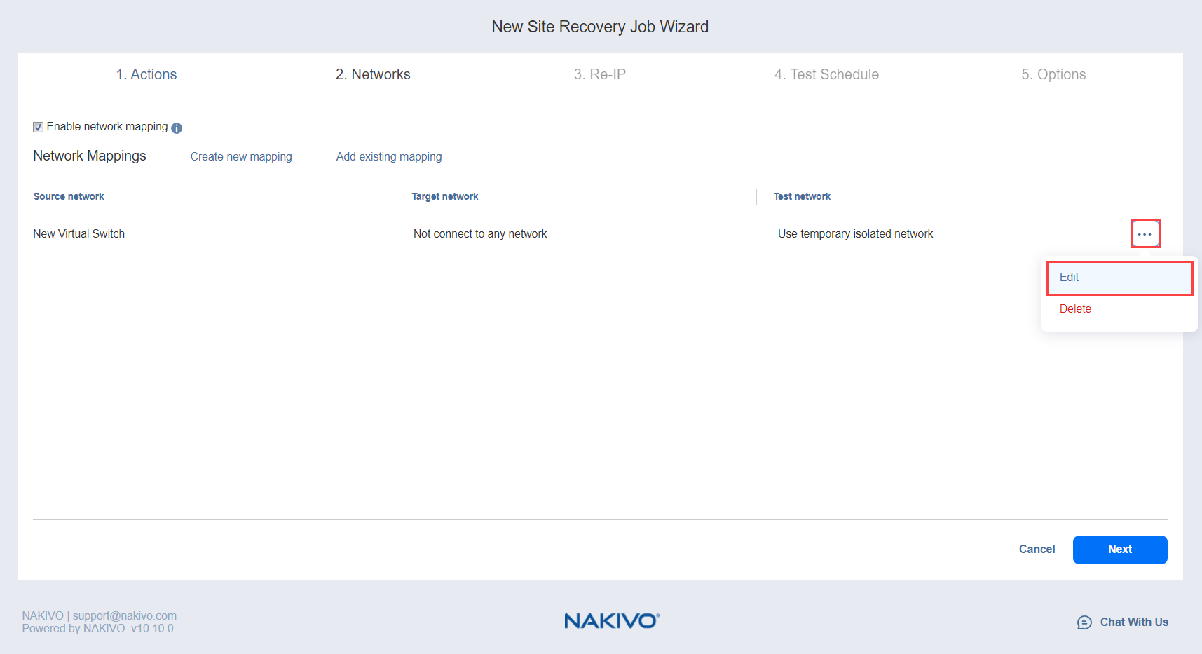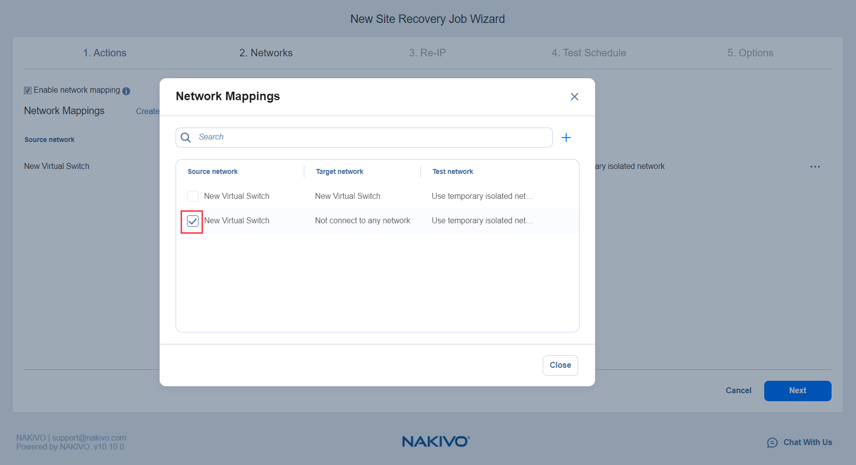 On the Networks page of the Site Recovery Job Wizard you can map source VM virtual networks to appropriate target virtual networks and test networks.