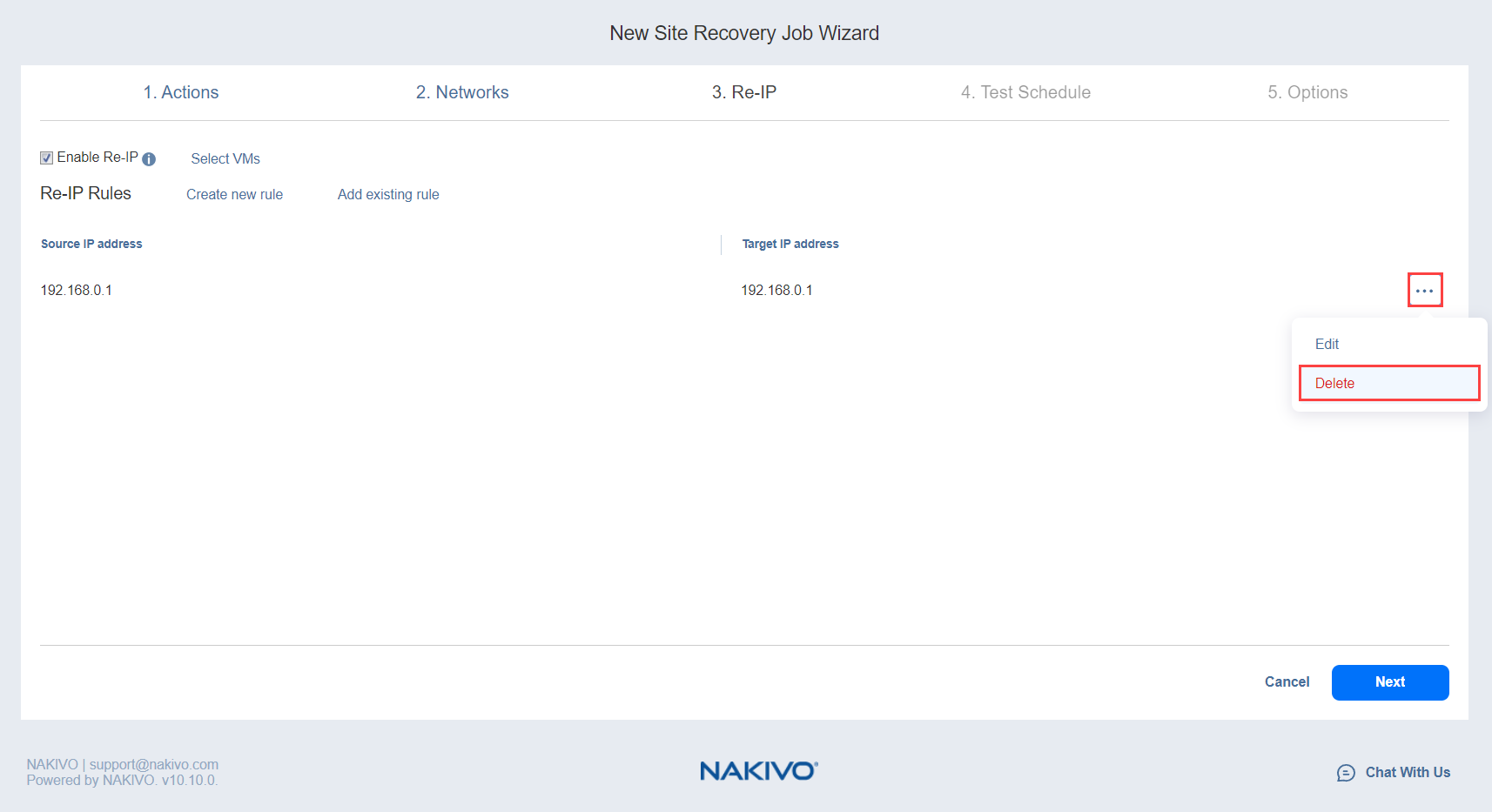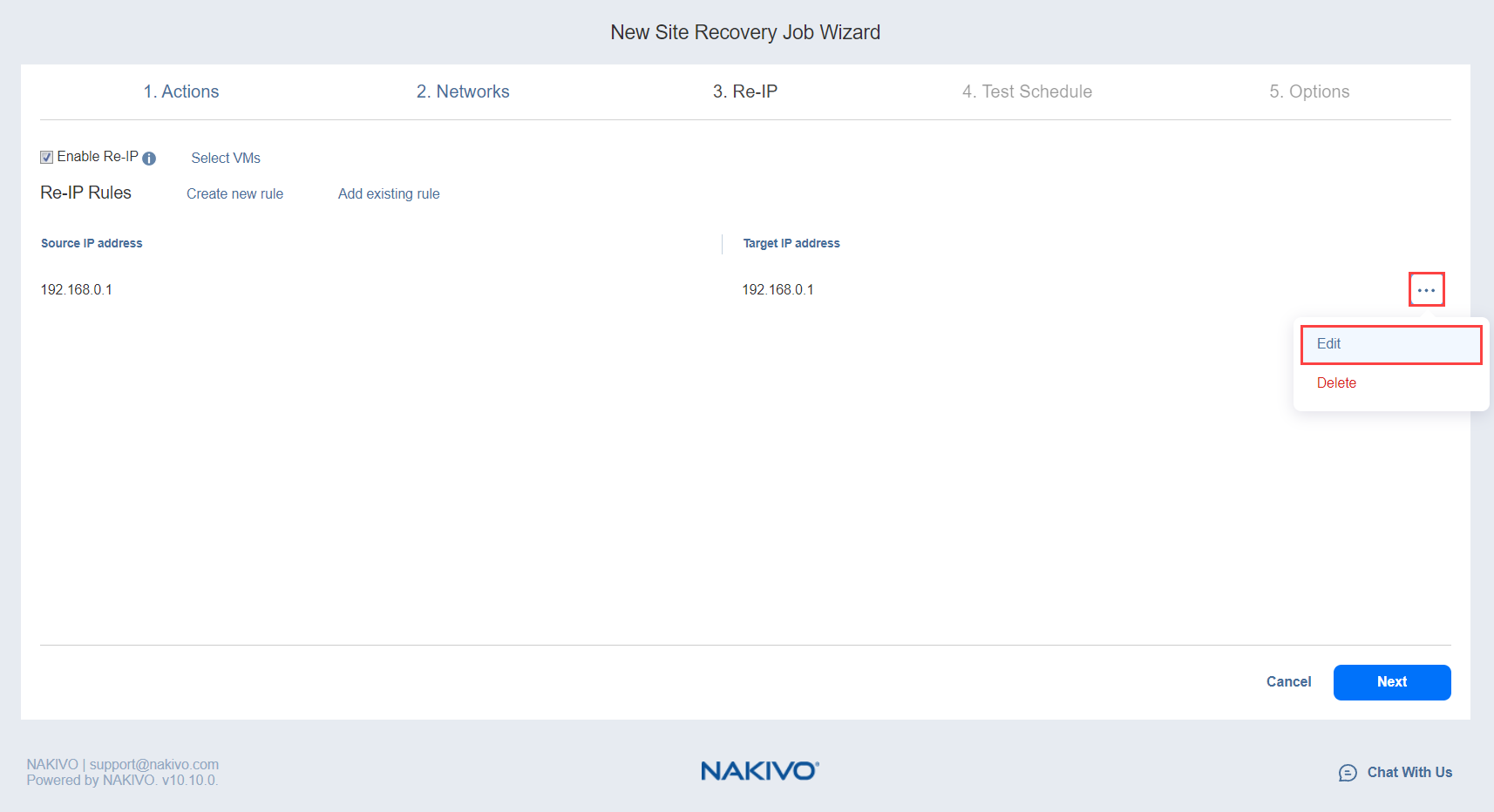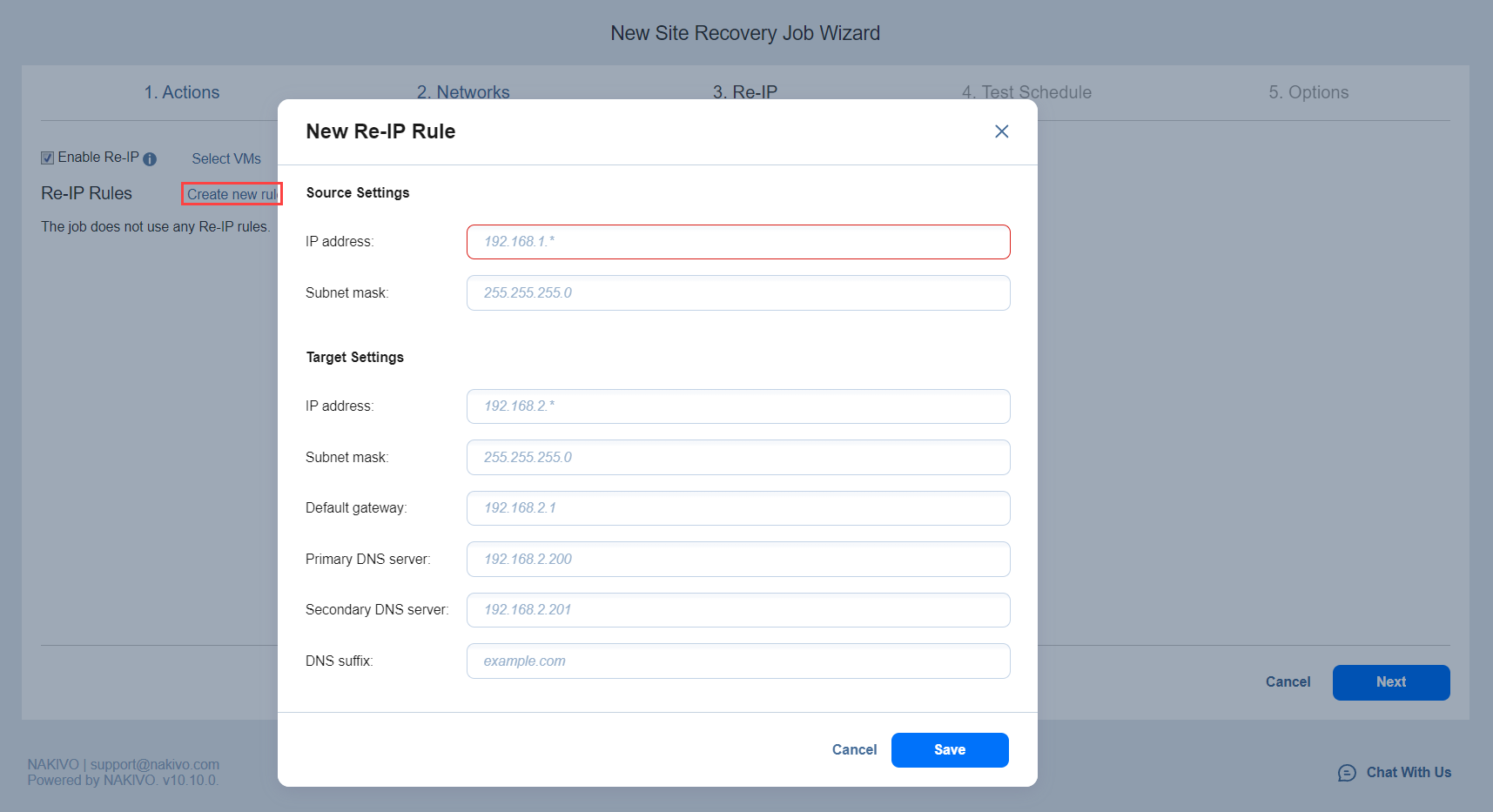You can use wildcards for IP addresses. For example, when the 192.168.1.* -> 10.30.30.* Re-IP rule is available, it will change the source VM IP address like 192.168.1.50 to the 10.30.30.50 IP address, for your site recovery job.