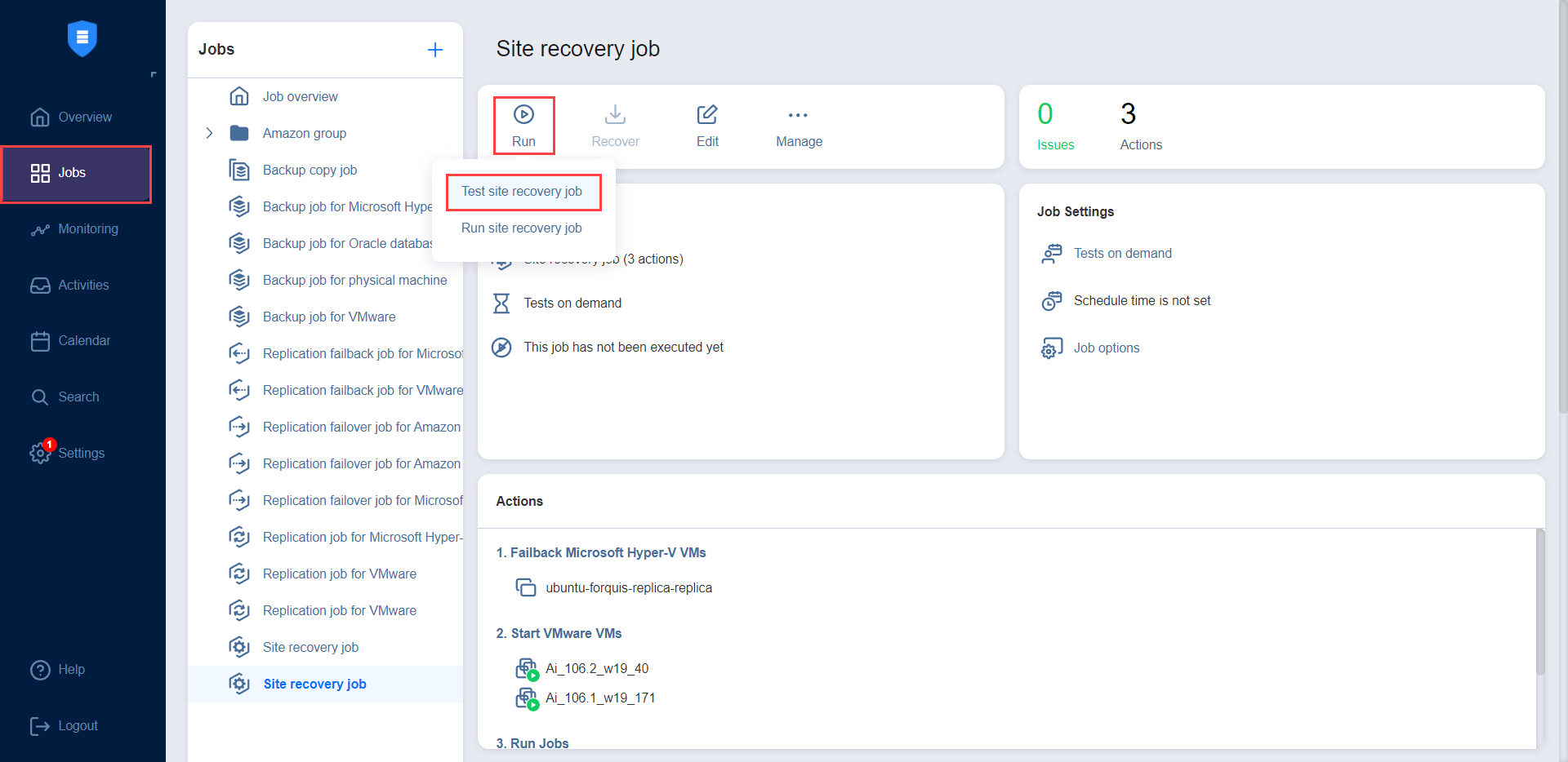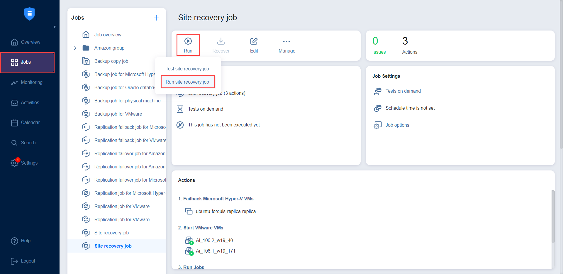 In the Jobs menu, select your site recovery job and then click the Run button.