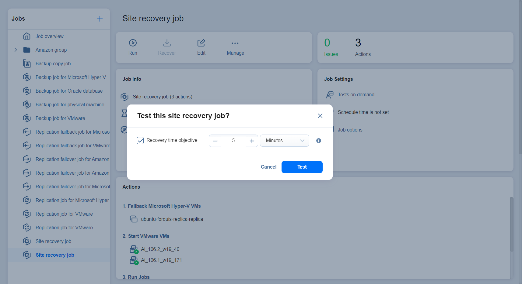 Running your site recovery job in the test mode allows you to verify the site recovery workflow and results.