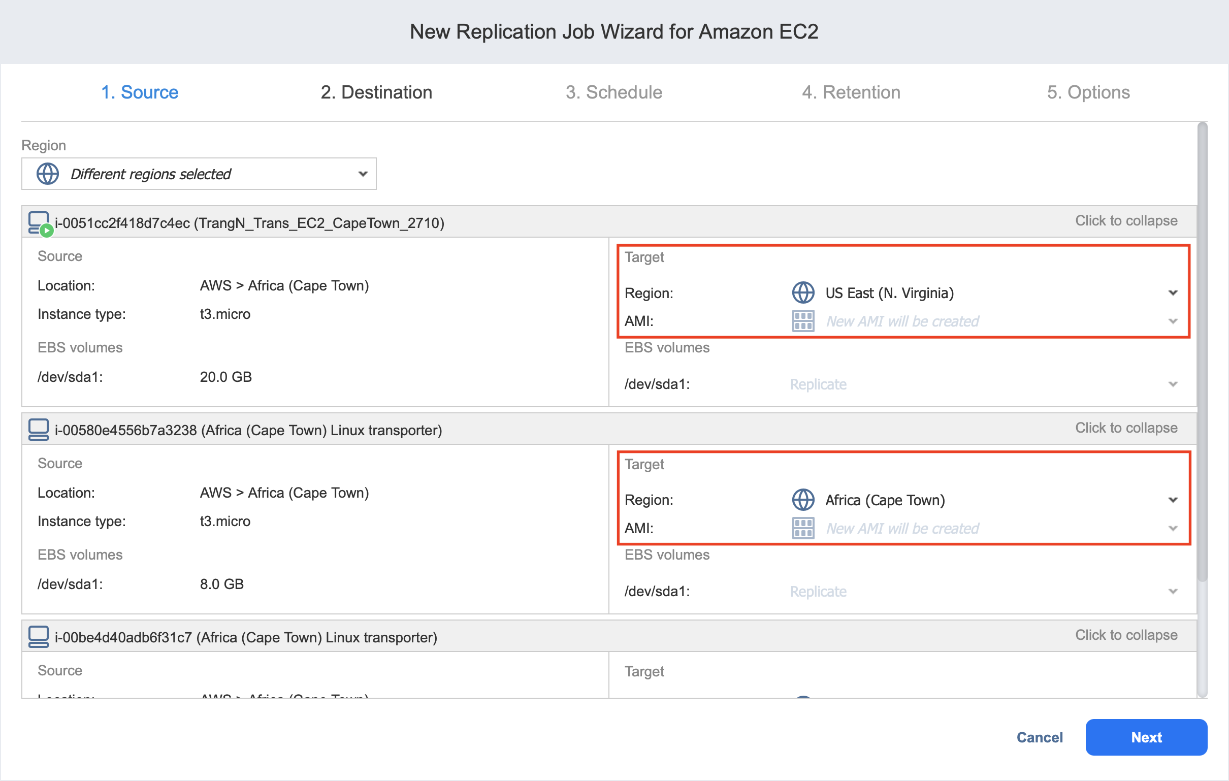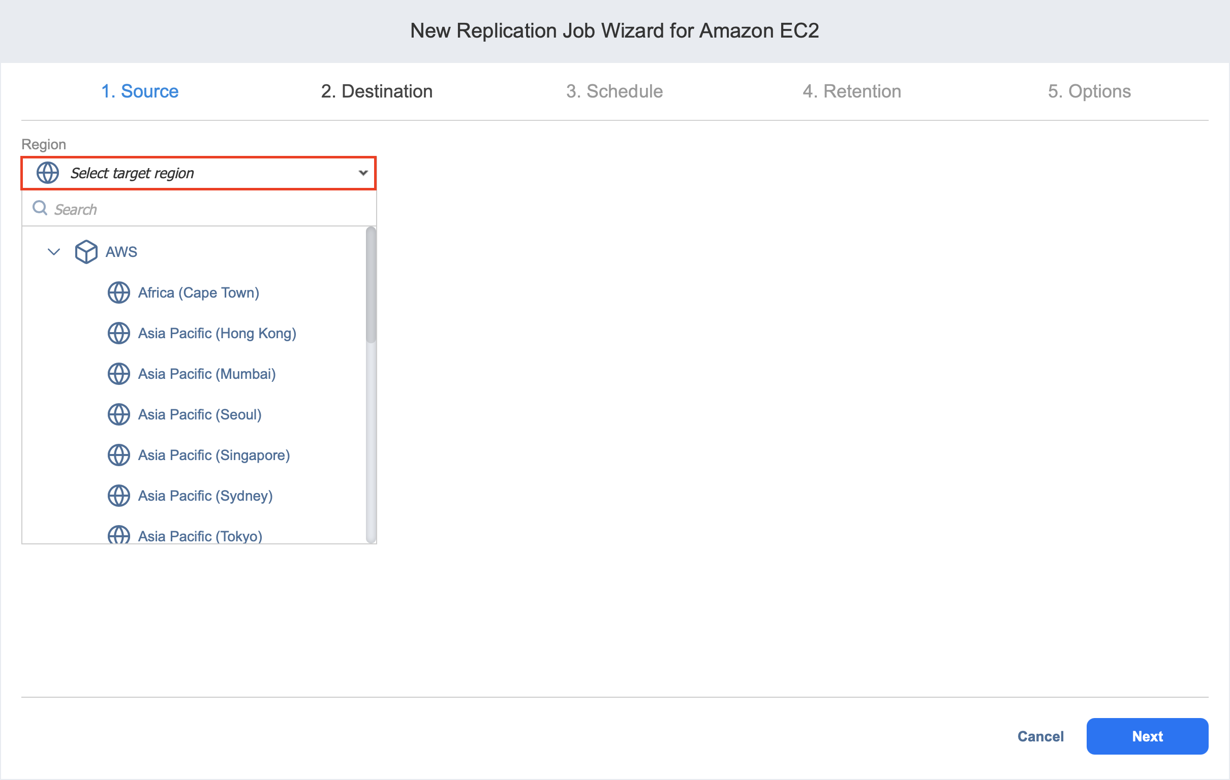 To replicate all Amazon EC2 Instances to the same region, select a target region from the Region drop-down list.