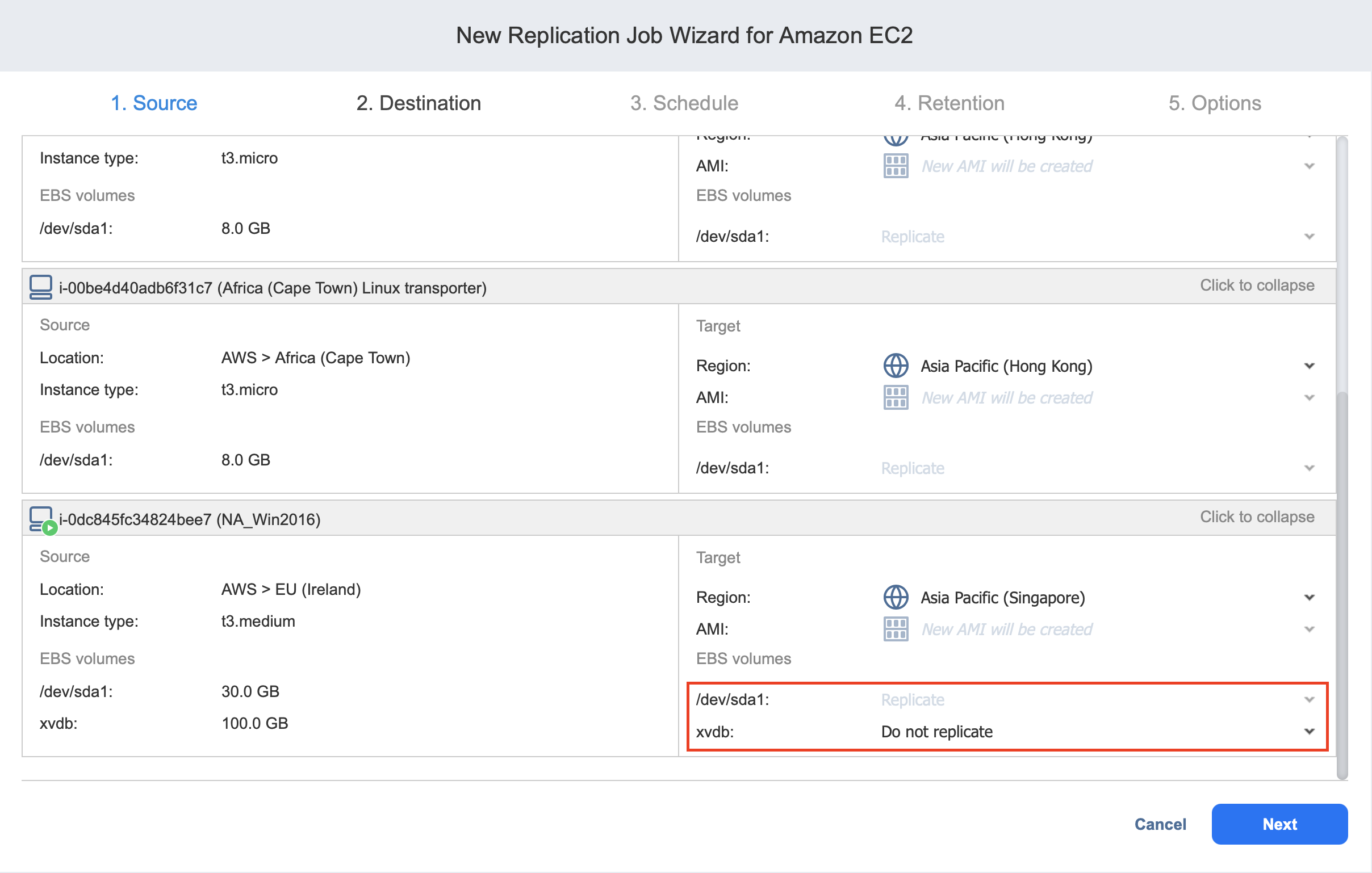 If you do not want to replicate some EBS volumes of an Amazon EC2 Instance, you can exclude those EBS volumes from the replication job. Follow the steps below to exclude the EBS volumes: