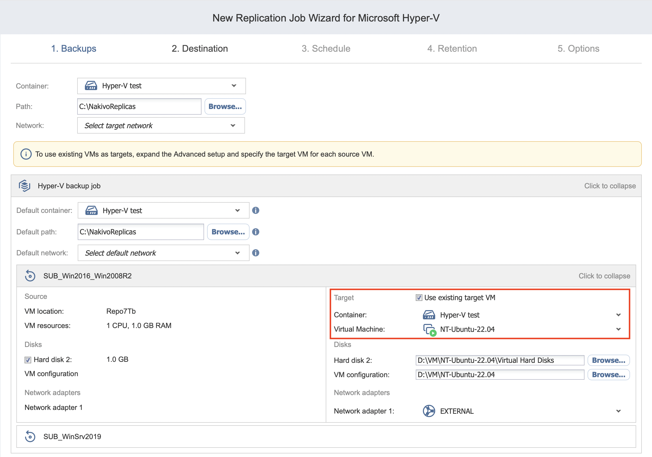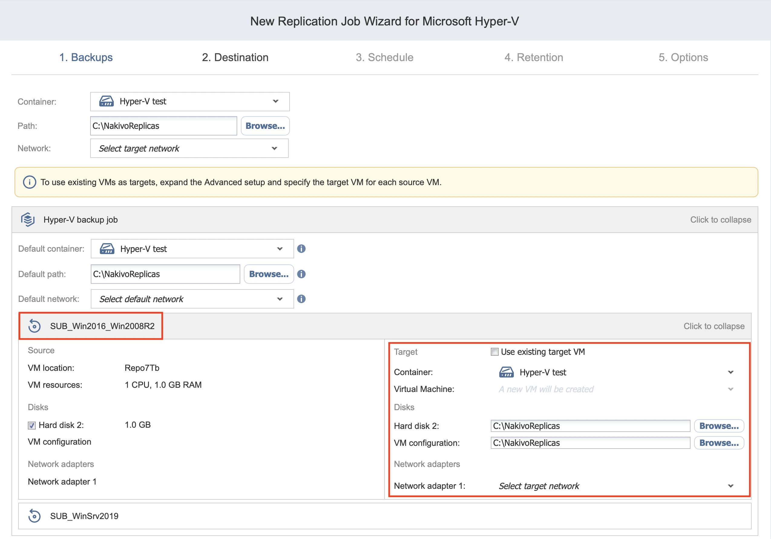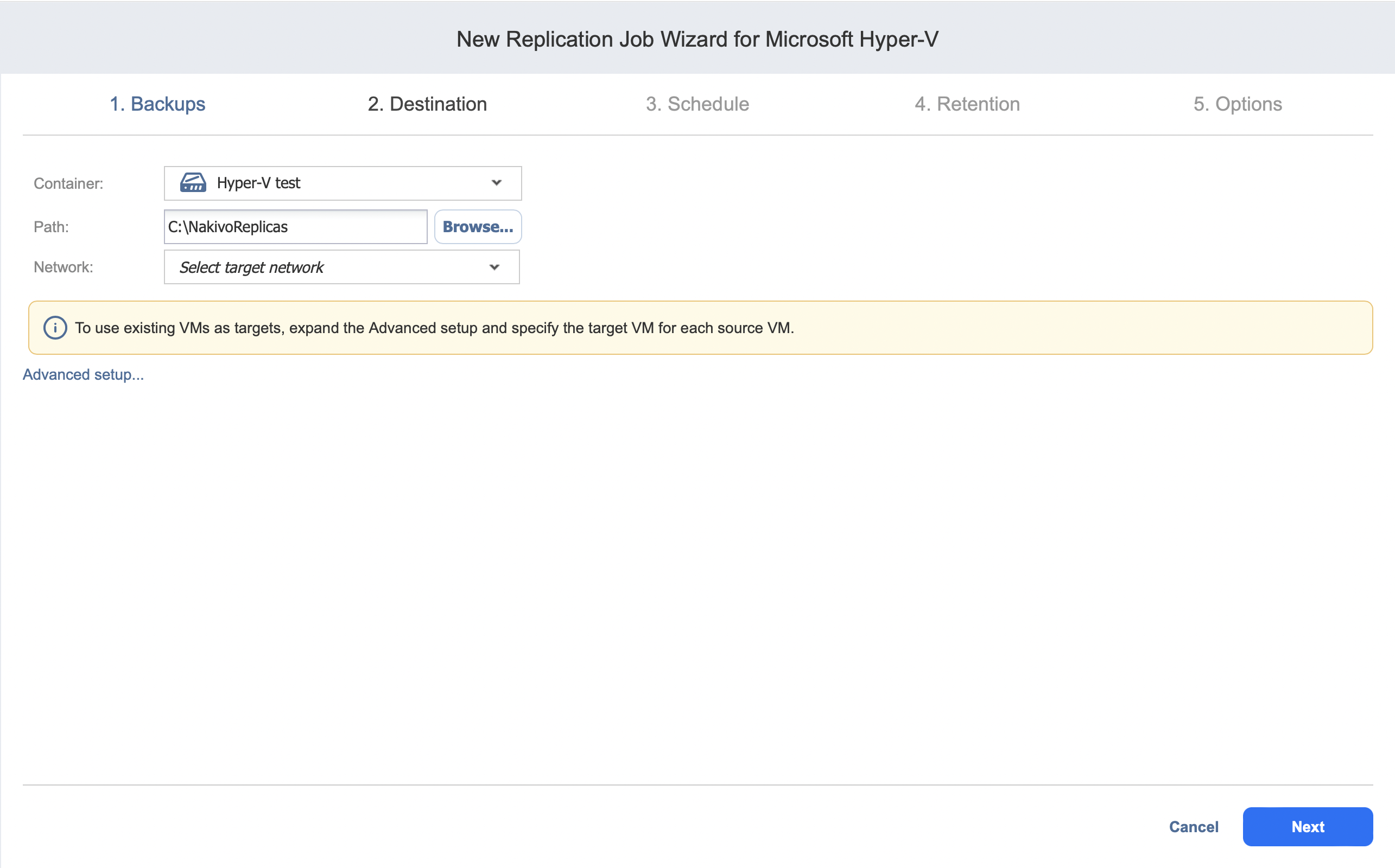 If you are creating a Replication job from an existing Backup job, select the target network from the Network drop-down list. For more details, see Replication Job Wizard for Hyper-V: Source.