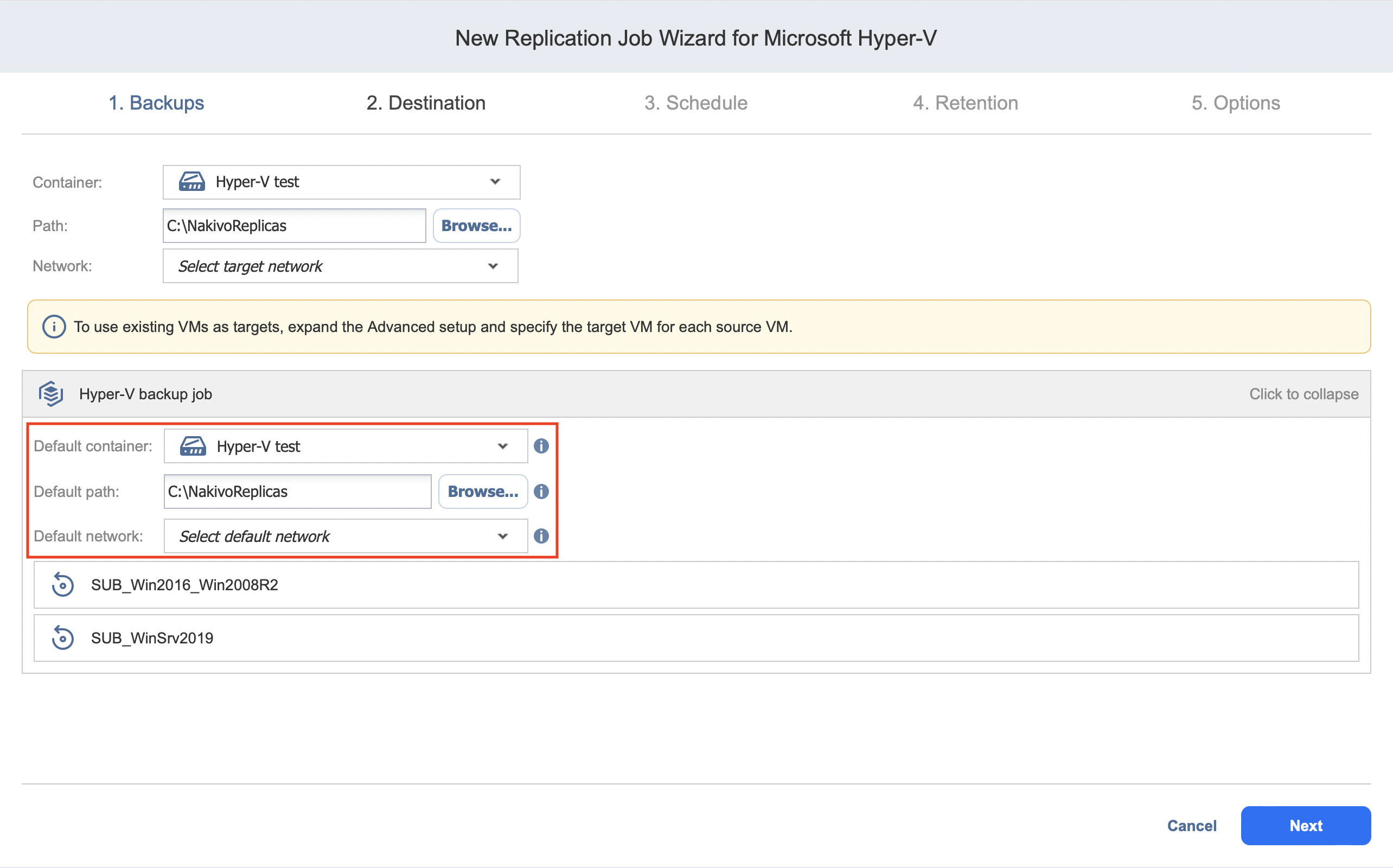 If you have chosen a Backup job on the Source page, you can choose a Default Network.