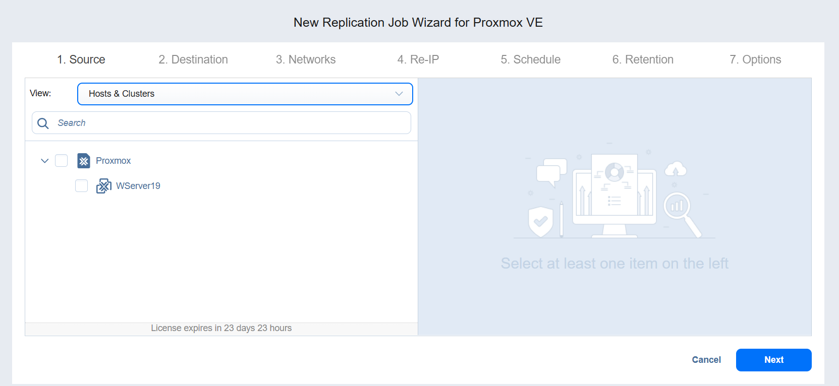 On the Source page of the wizard, select one of the views to add Proxmox VE items to your replication job.