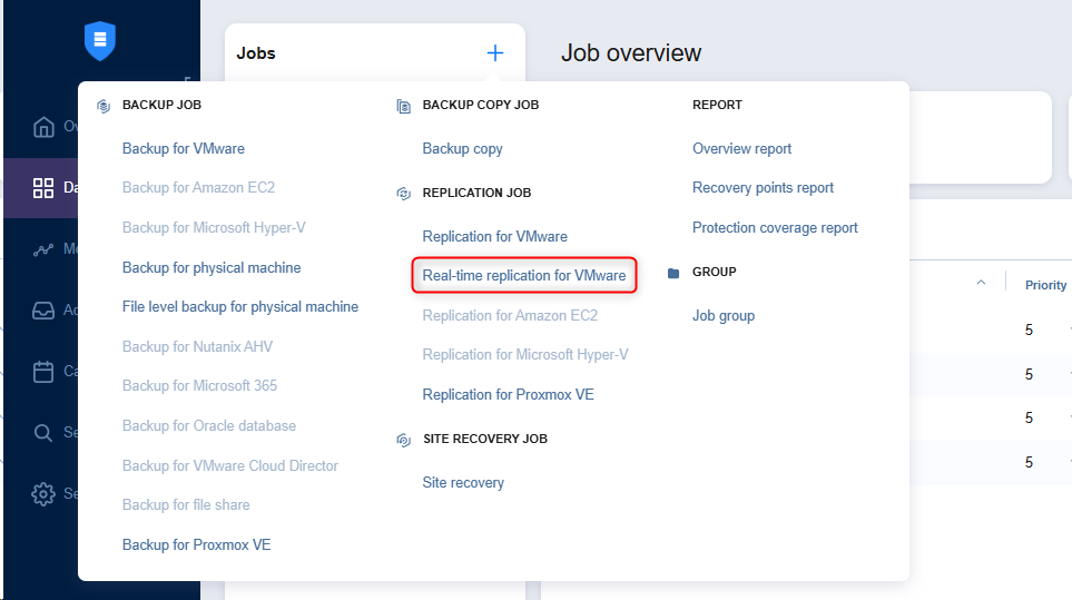 To create a real-time replication job for VMware, click the plus Create button in the Data Protection menu and then select Real-time replication for VMware.