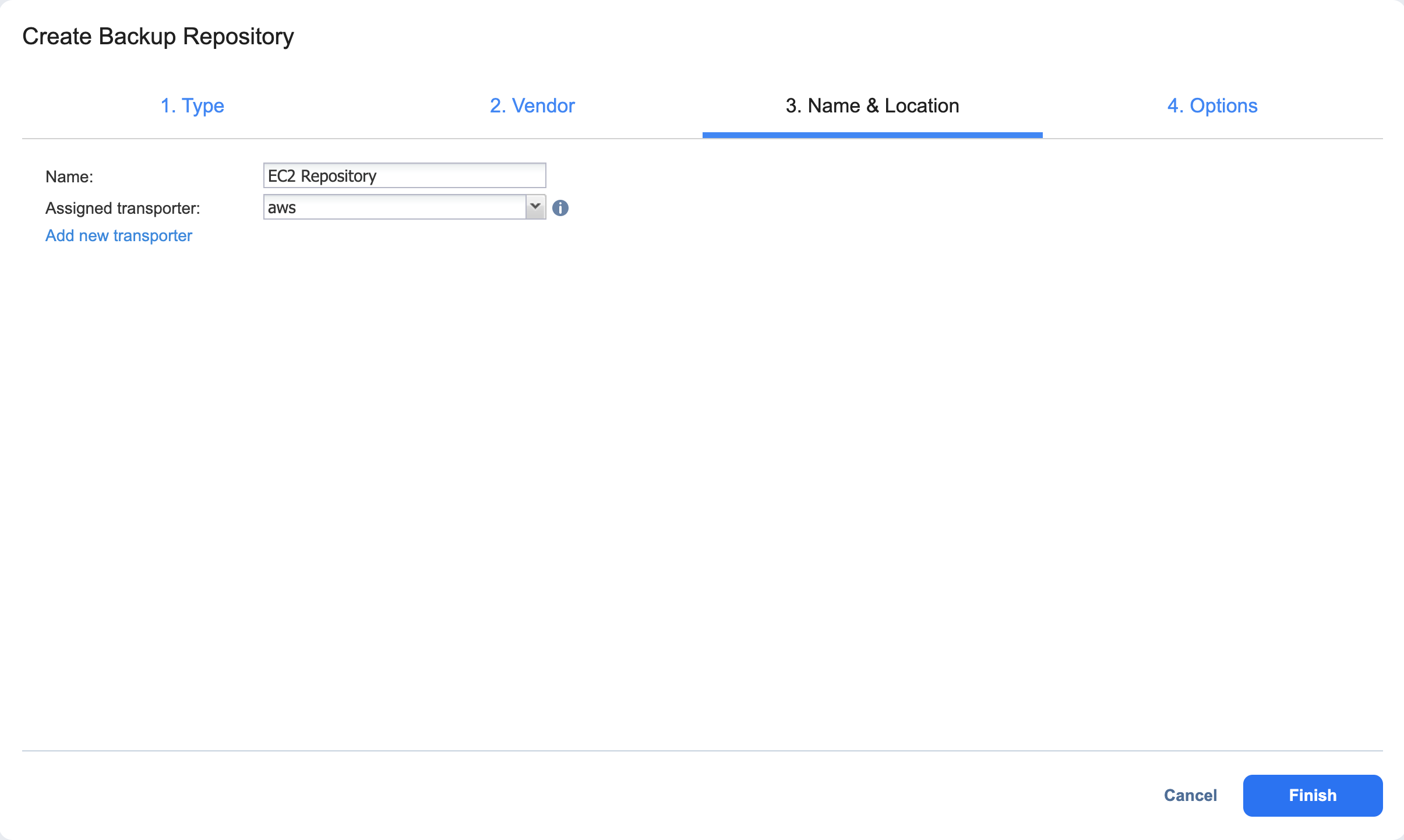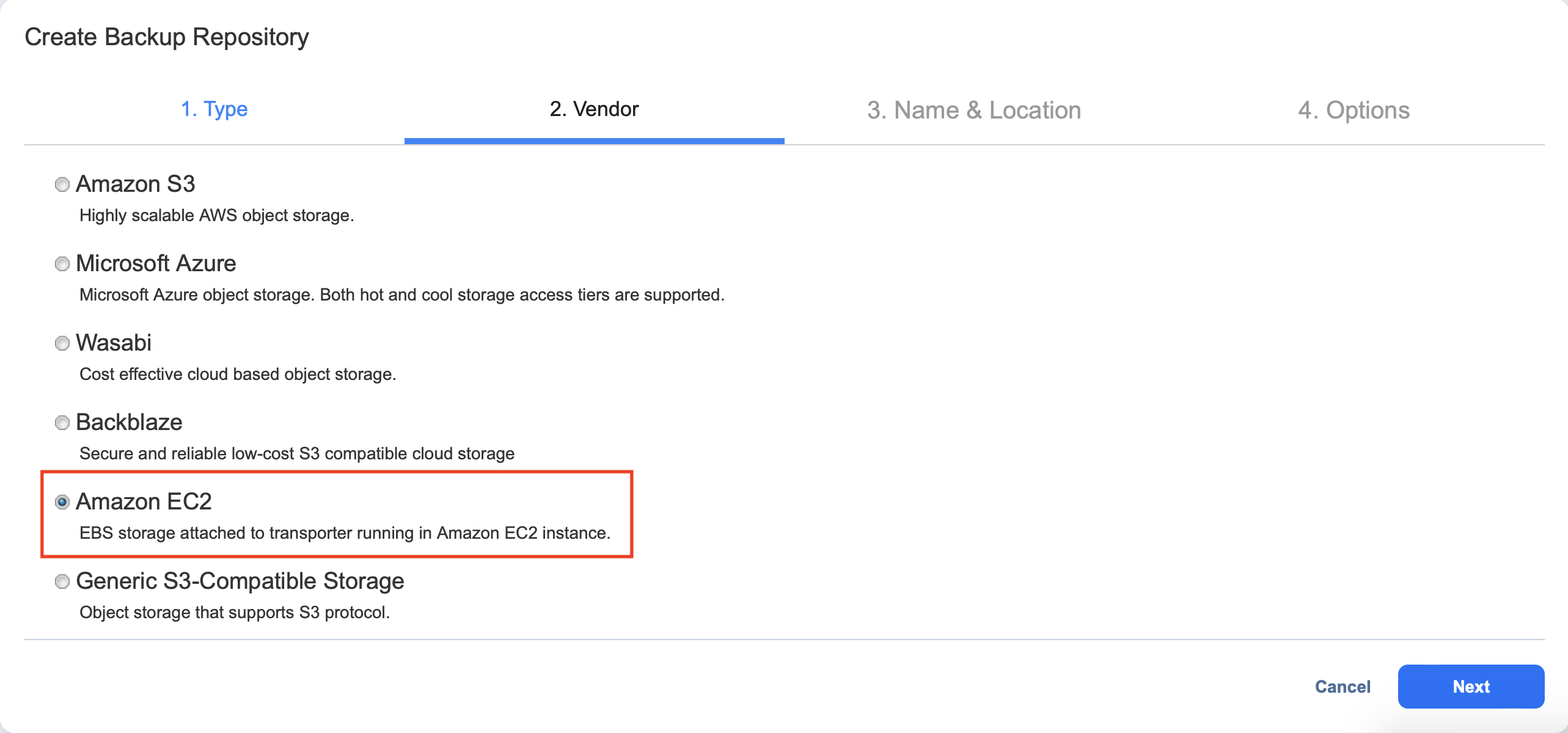 Choose this option if you want to create a Backup Repository in Amazon EC2. The Backup Repository will be created in the same region where the assigned Transporter is located.