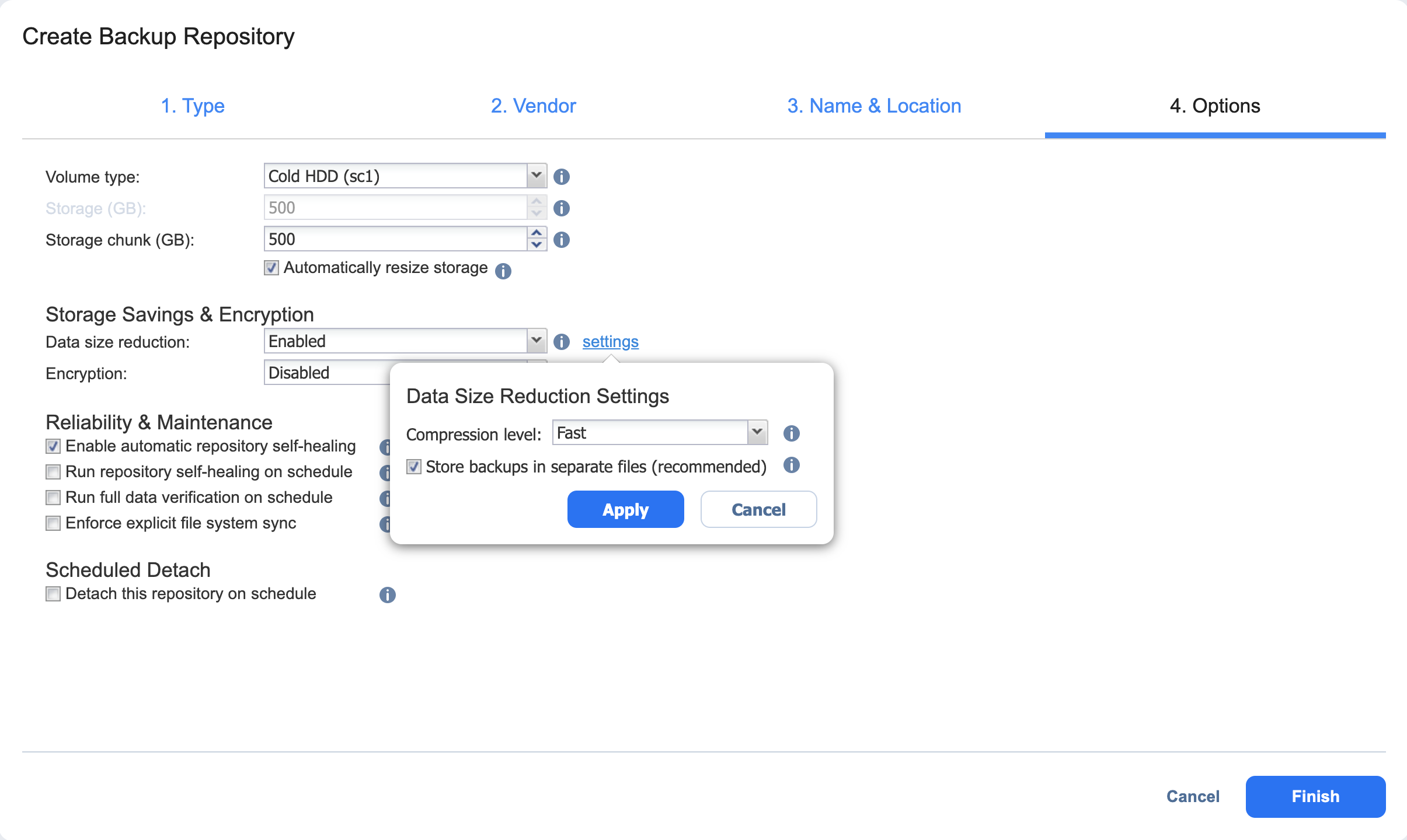 Data size reduction: When this option is enabled, NAKIVO Backup & Replication enables the use of data size reduction for this repository to save disk space. Note that this may put additional load on the CPU. Disabling data size reduction is required if the target is a deduplication storage appliance. Click Settings to configure the settings. A popup window appears. Set the following: