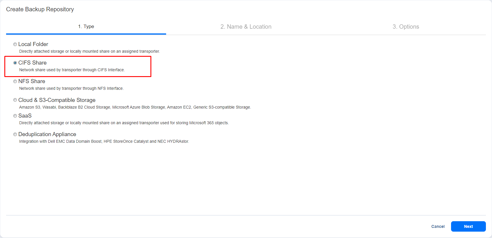 On the Type page of the Create Backup Repository wizard, select CIFS Share and click Next to move to the next page of the wizard.