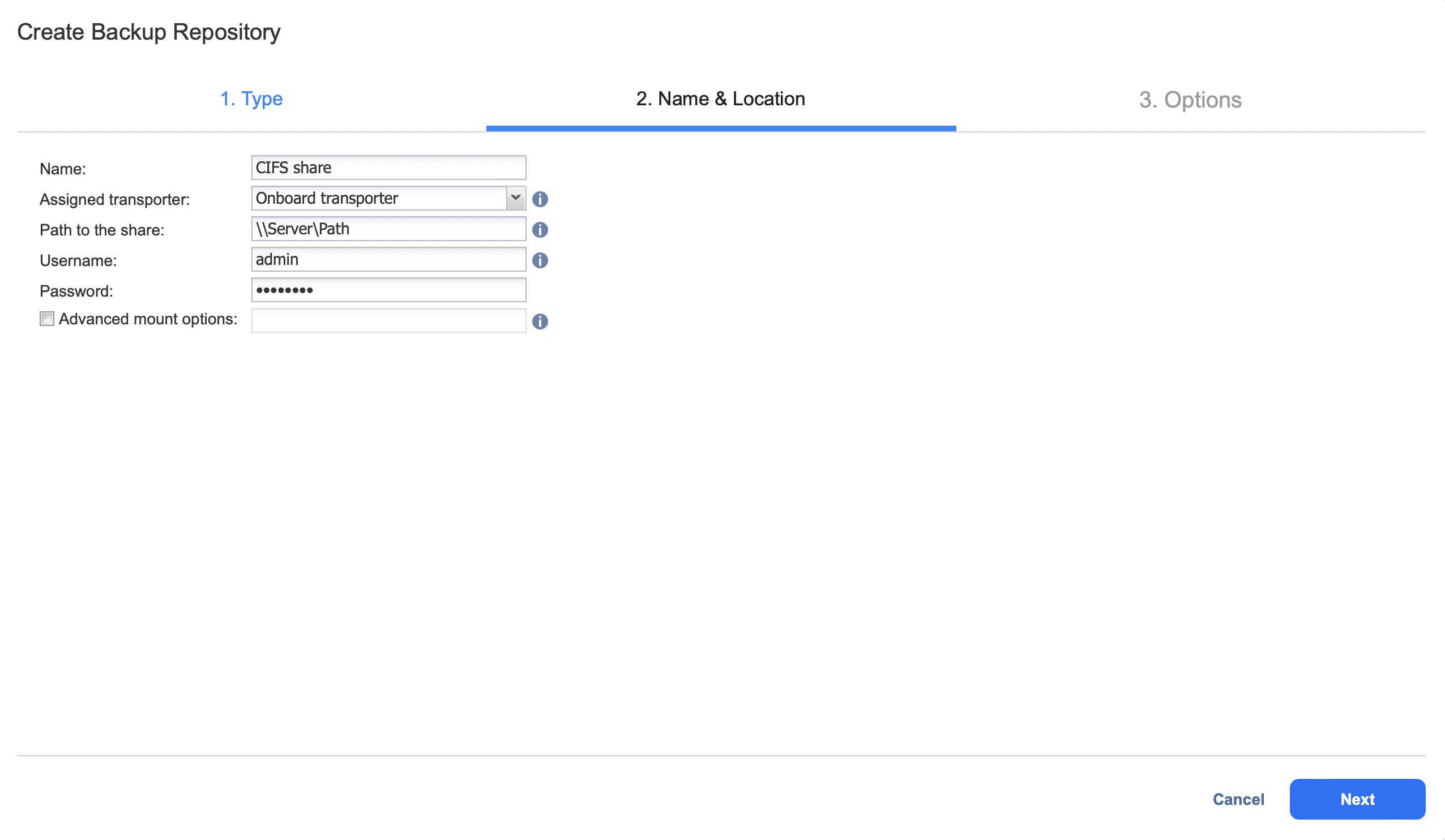 To create a Backup Repository on a Windows CIFS share, proceed as described in the following sections: