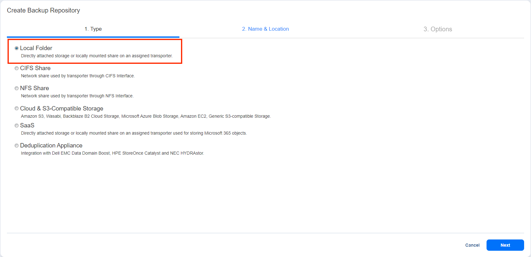 On the Type page of the Create Backup Repository wizard, select Local Folder and click Next to move to the next page of the wizard.