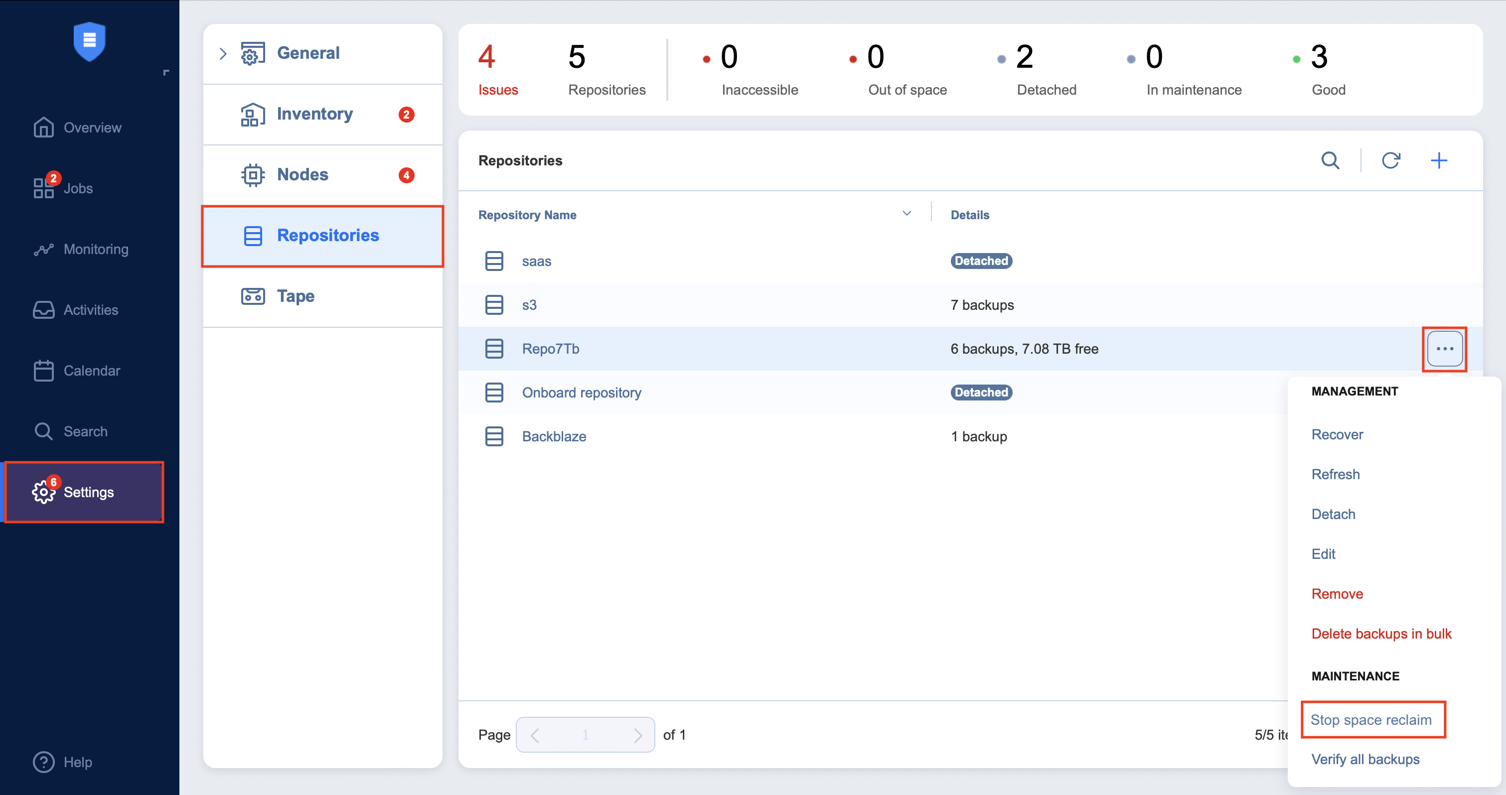 In the title of the Backup Repository, click ••• and then click Reclaim unused space.