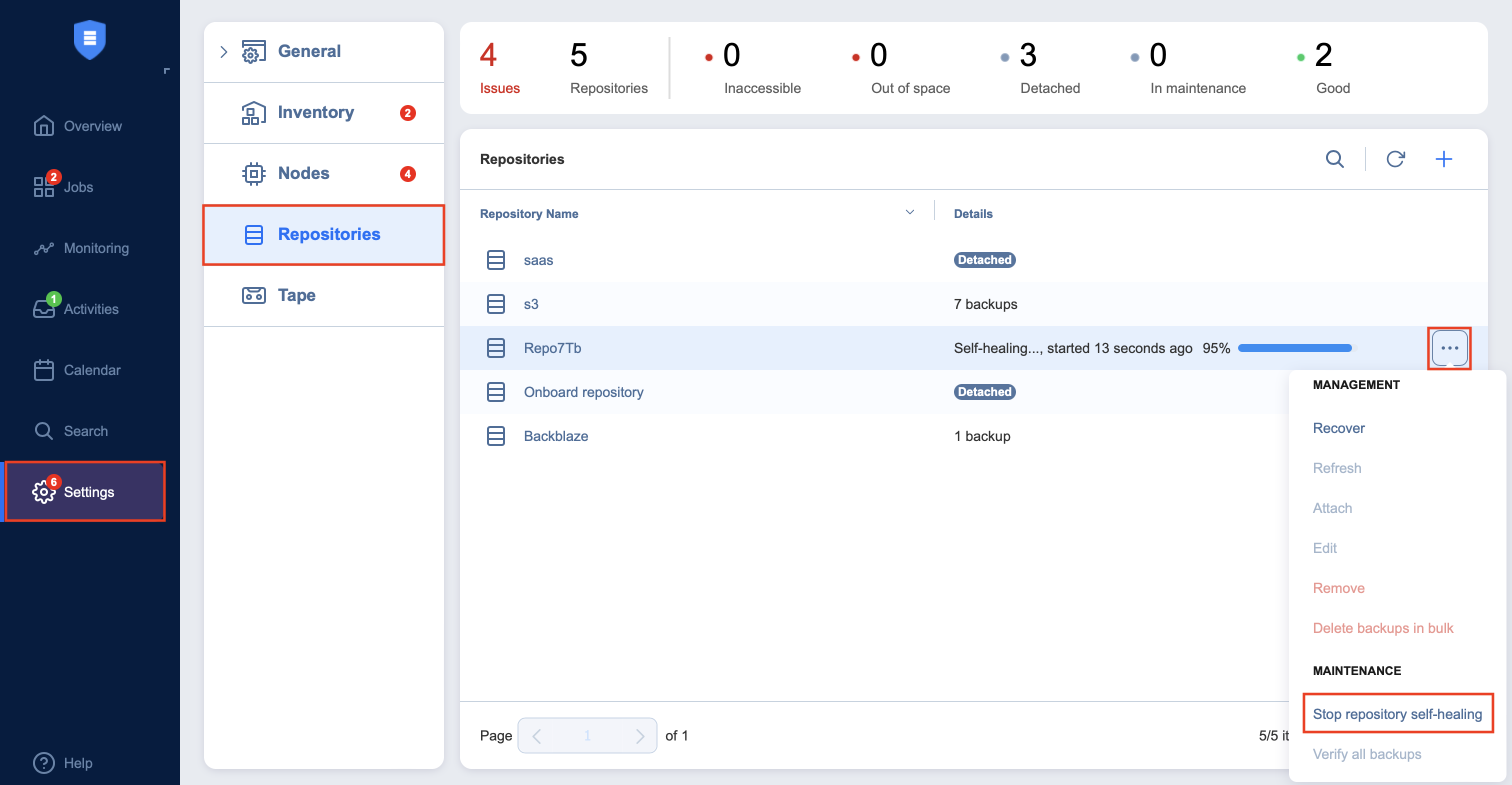 You can stop the self-healing process at any time (for example, to run a recovery job, move your Backup Repository to a new location, or put your backup storage on maintenance).