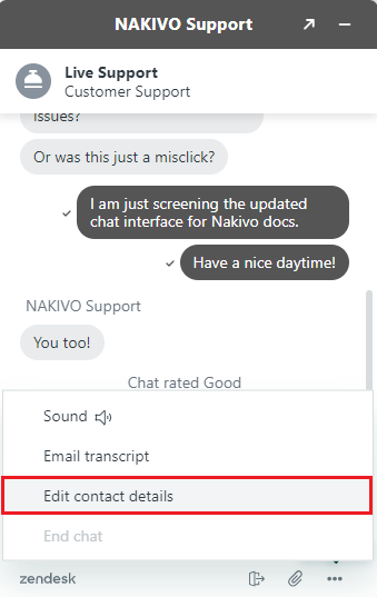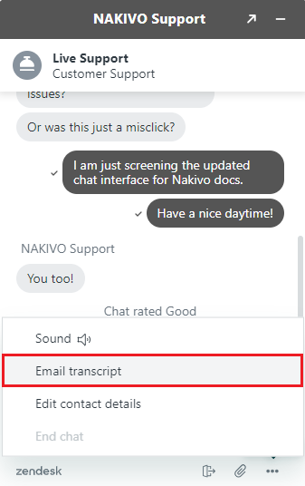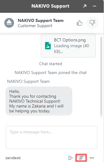 5. Your message is sent to a NAKIVO representative and the built-in Live Support Chat dialog box opens.