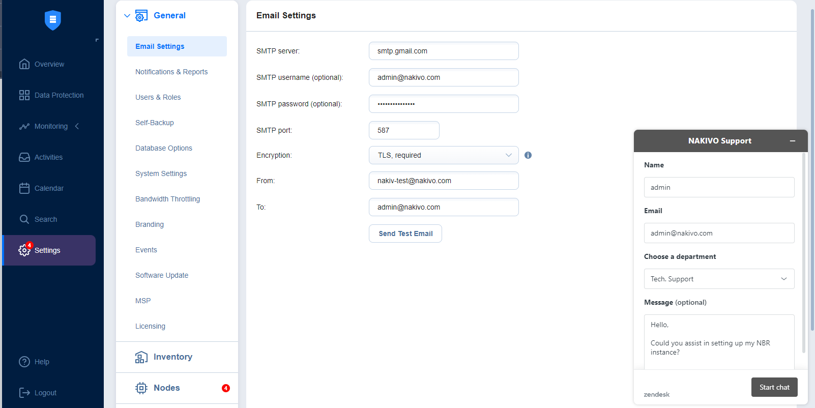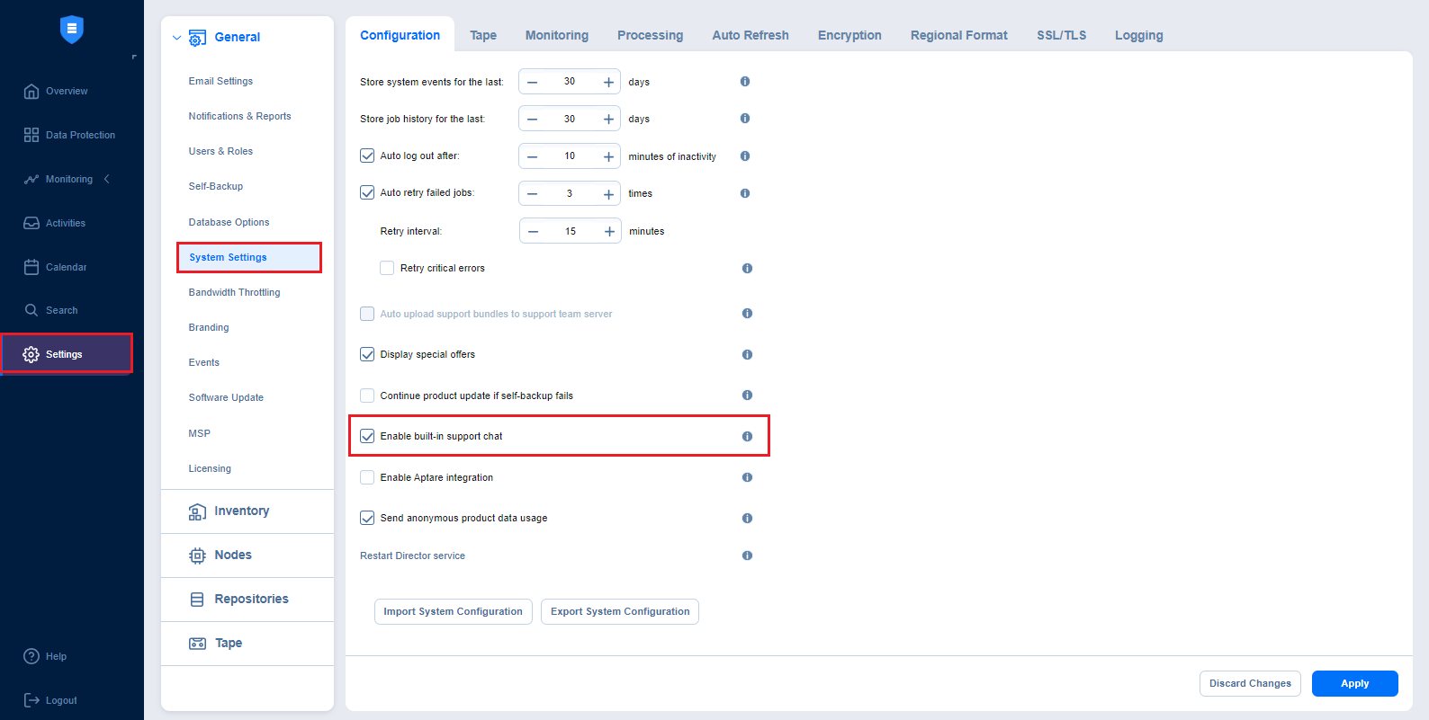 By default, the built-in support chat is enabled in your instance of NAKIVO Backup & Replication.
