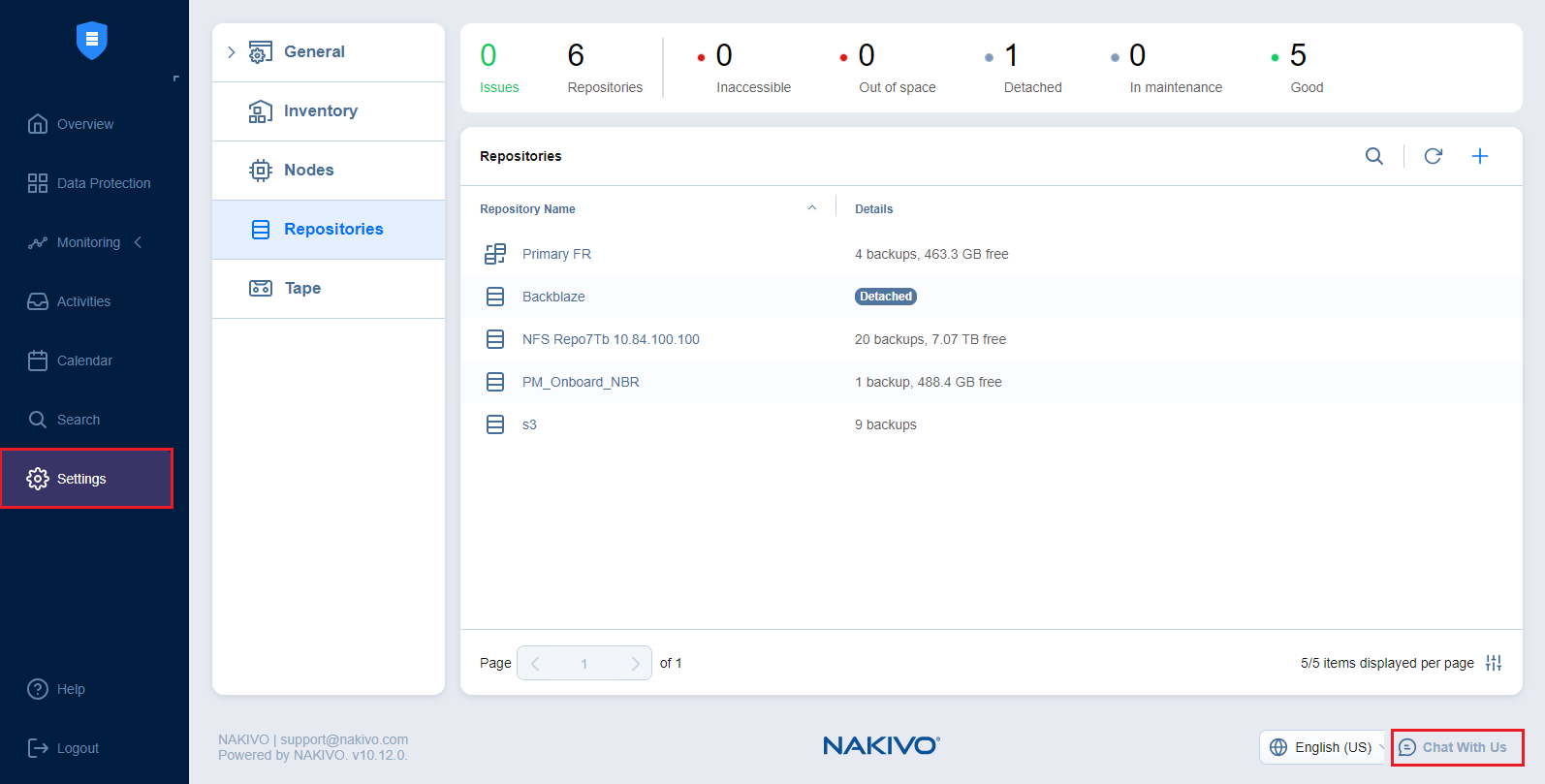 In the lower right corner of the NAKIVO Backup & Replication interface, click the Chat With Us button.
