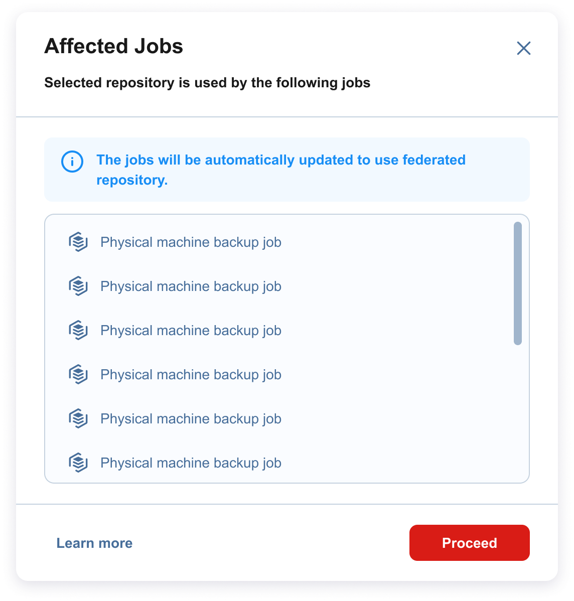 If the selected member is used as a destination for existing jobs, the Affected Jobs dialogue is displayed with the list of jobs using the selected repository as a destination or source. Click Proceed to lock the selected repository before adding it as a new member and update the jobs after the federated repository is created.