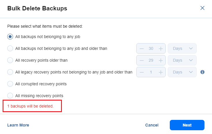In the Bulk Delete Backups dialog box that opens, select one of the available options:
