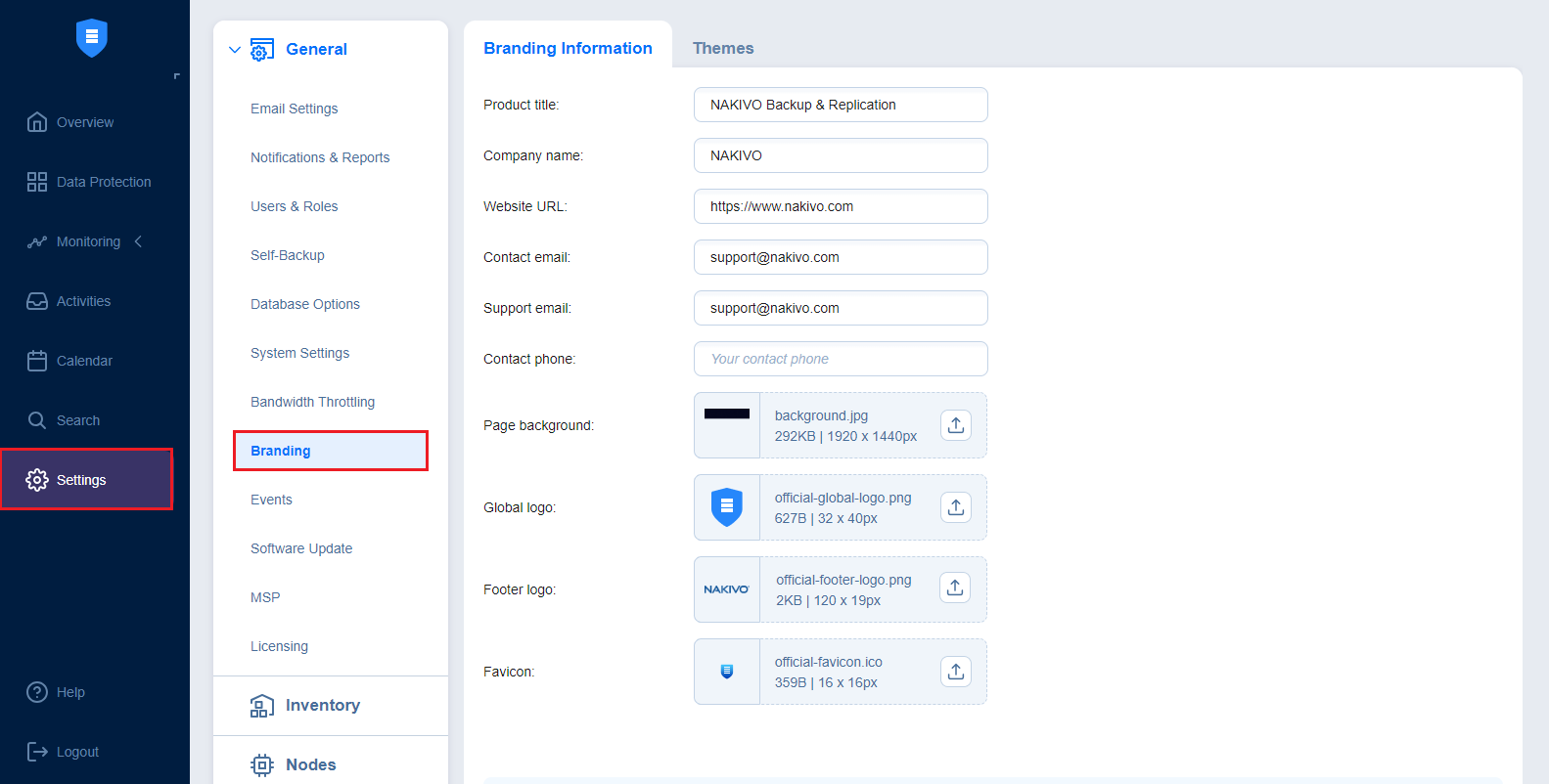 On the Themes tab, you can configure the colors of your NAKIVO Backup & Replication instance.