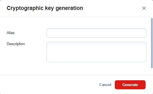 In the dialog box that appears, enter the alias and its description (optional) and click Generate to initiate generation of a new symmetric cryptographic key in the specified account. For more details, refer to the AWS::KMS::Alias page. Click the Cancel or X button to close the dialog box without applying any changes.