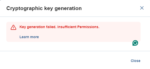 If the key generation fails, a dialog box with the reason for the failure appears: